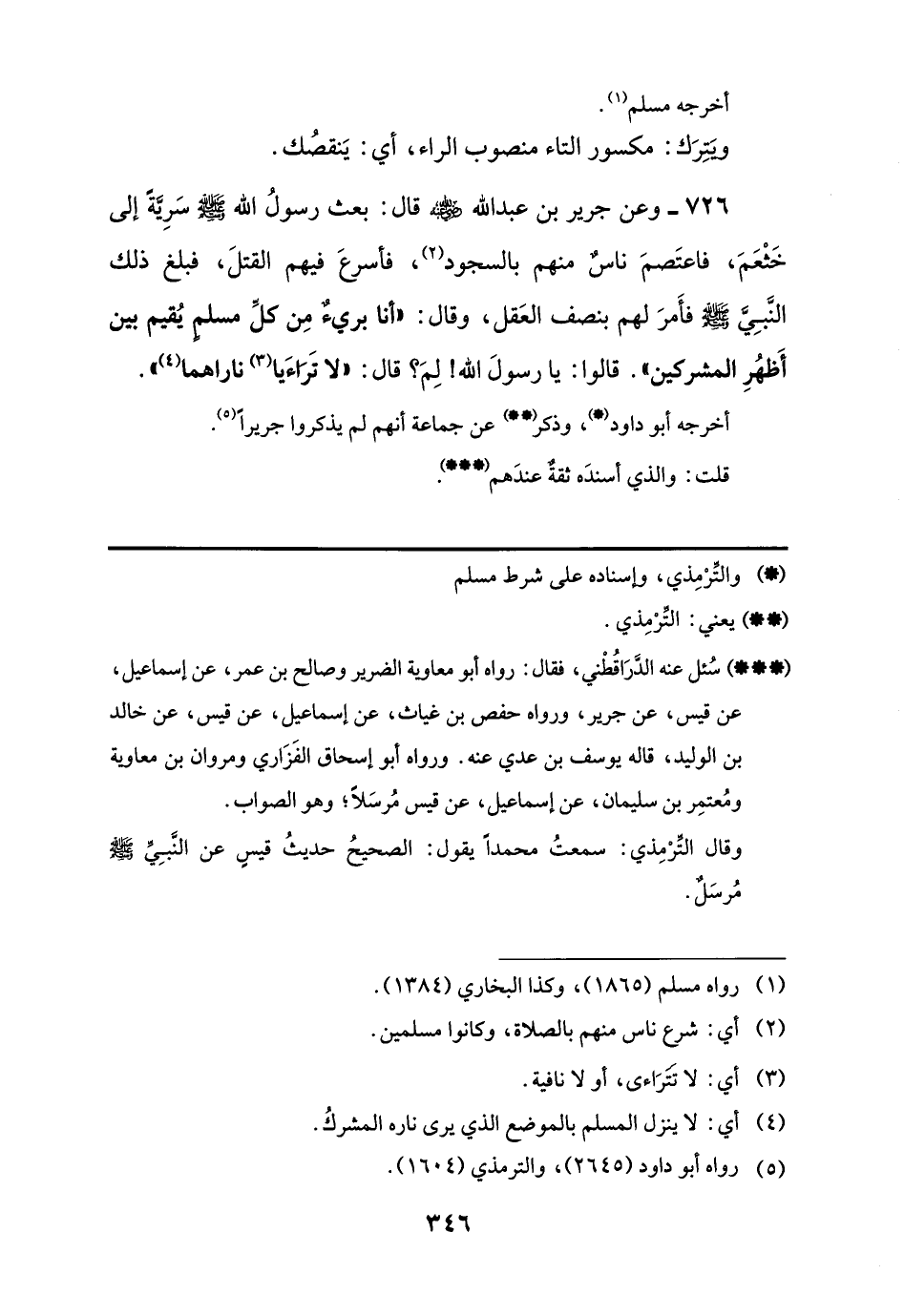 726 - وعن جرير بن عبد اللَّه -رضي اللَّه عنه- قال: بعث رسولُ اللَّه -صلى اللَّه عليه وسلم- سَرِيَّةً إلى خَثْعَمَ، فاعتَصمَ ناسٌ منهم بالسجود (¬2)، فأسرعَ فيهم القتلَ، فبلغ ذلك النَّبِيَّ -صلى اللَّه عليه وسلم- فأمرَ لهم بنصف العَقل، وقال: "أنا بريءٌ مِن كلِّ مسلمٍ يُقيم بين أَظهُرِ المشركين". قالوا: يا رسولَ اللَّه! لِمَ؟ قال: "لا تَرَاءَيا (¬3) ناراهما (¬4) ".