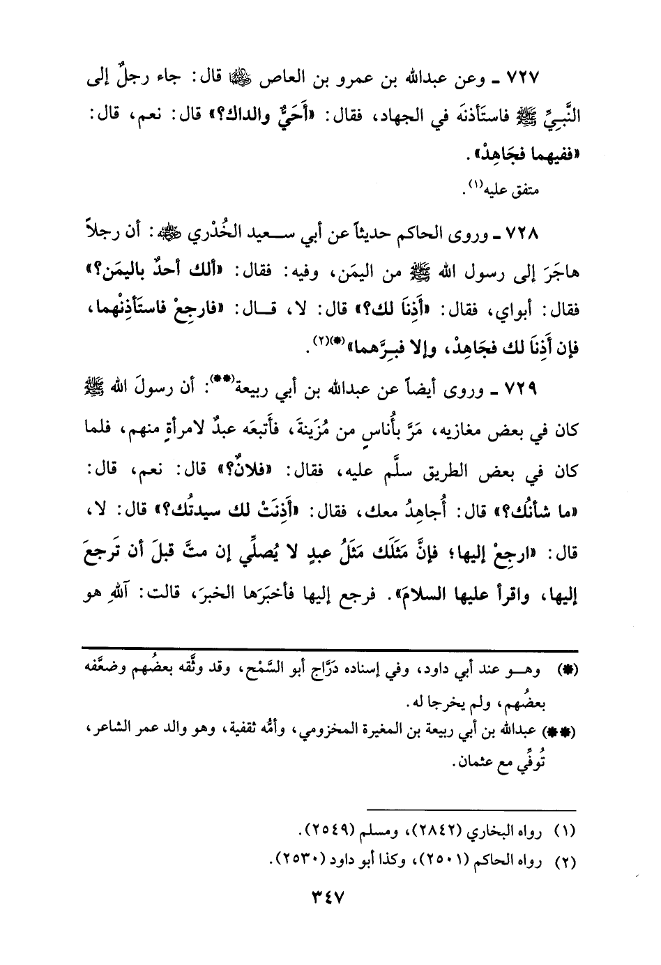 727 - وعن عبد اللَّه بن عمرو بن العاص -رضي اللَّه عنهما- قال: جاء رجلٌ إلى النَّبِيِّ -صلى اللَّه عليه وسلم- فاستأذنَه في الجهاد، فقال: "أَحَيٌّ والداك؟ "، قال: نعم، قال: "ففيهما فجَاهِدْ".