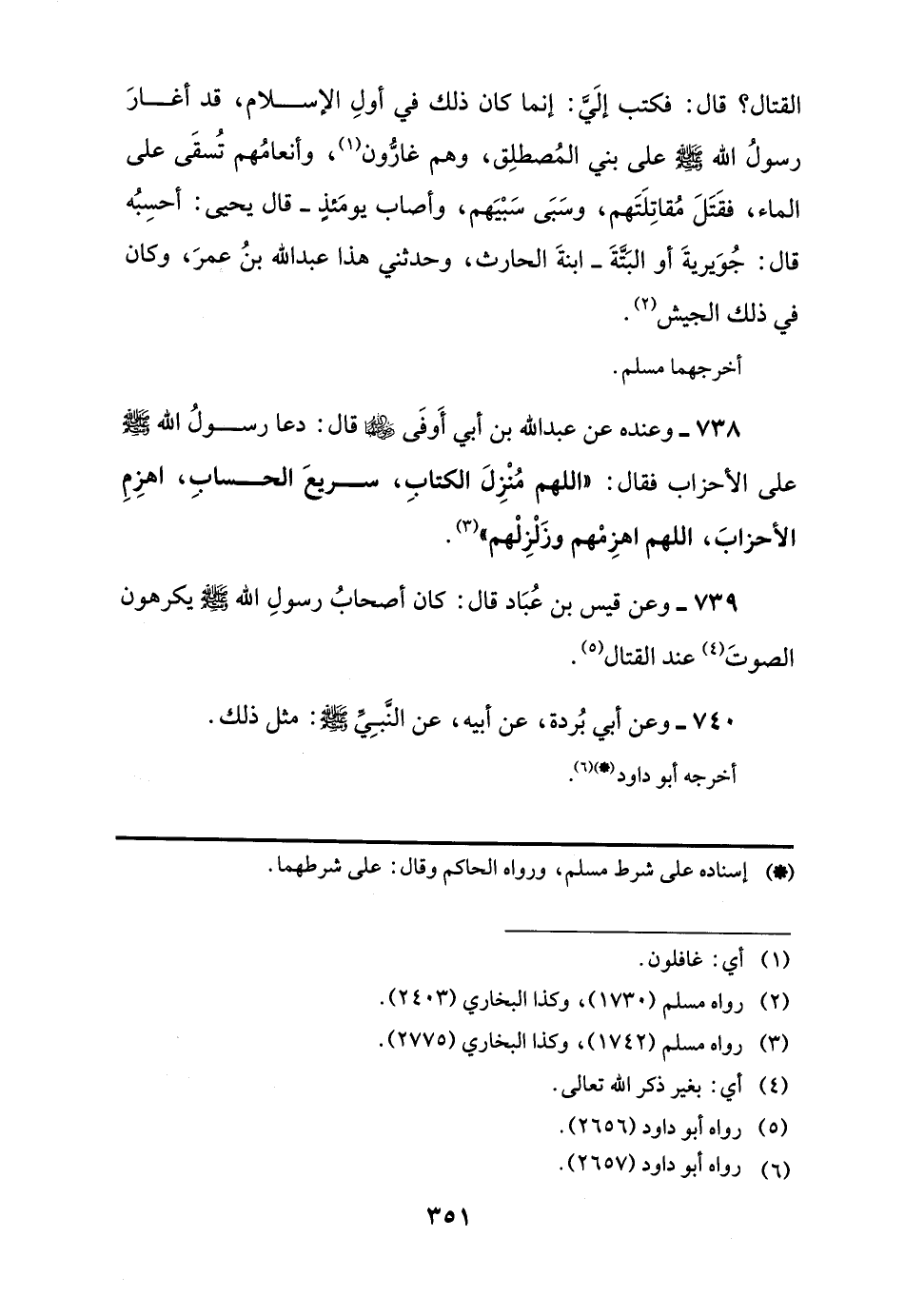 738 - وعنده عن عبد اللَّه بن أبي أَوفَى -رضي اللَّه عنهما- قال: دعا رسولُ اللَّه -صلى اللَّه عليه وسلم- على الأحزاب فقال: "اللهم مُنْزِلَ الكتابِ، سريعَ الحسابِ، أهزِمِ الأحزابَ، اللهم اهزِمْهم وزَلْزِلْهم" (¬3).