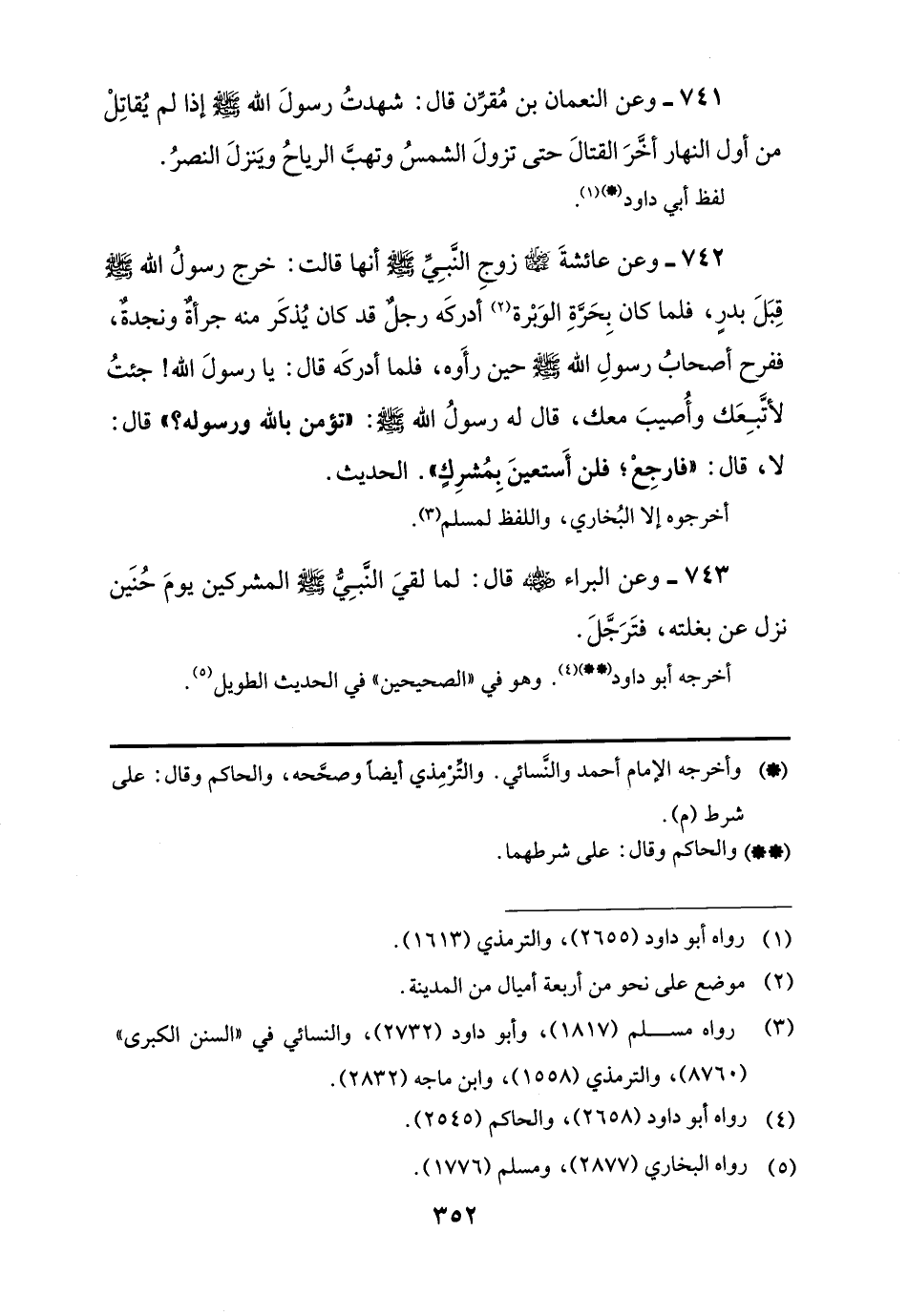 741 - وعن النعمان بن مُقرِّن قال: شهدتُ رسولَ اللَّه -صلى اللَّه عليه وسلم- إذا لم يُقاتِلْ من أول النهار أخَّرَ القتالَ حتى تزولَ الشمسُ ولهبَّ الرياحُ ويَنزلَ النصرُ.