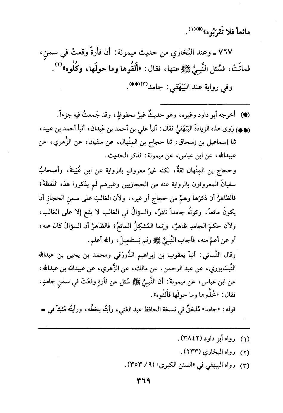 767 - وعند البُخاري من حديث ميمونة: أن فأرةً وقعتْ في سمنٍ، فماتَتْ، فسُئل النَّبِيُّ -صلى اللَّه عليه وسلم- عنها، فقال: "أَلقُوها وما حولَها، وكُلُوه" (¬2).