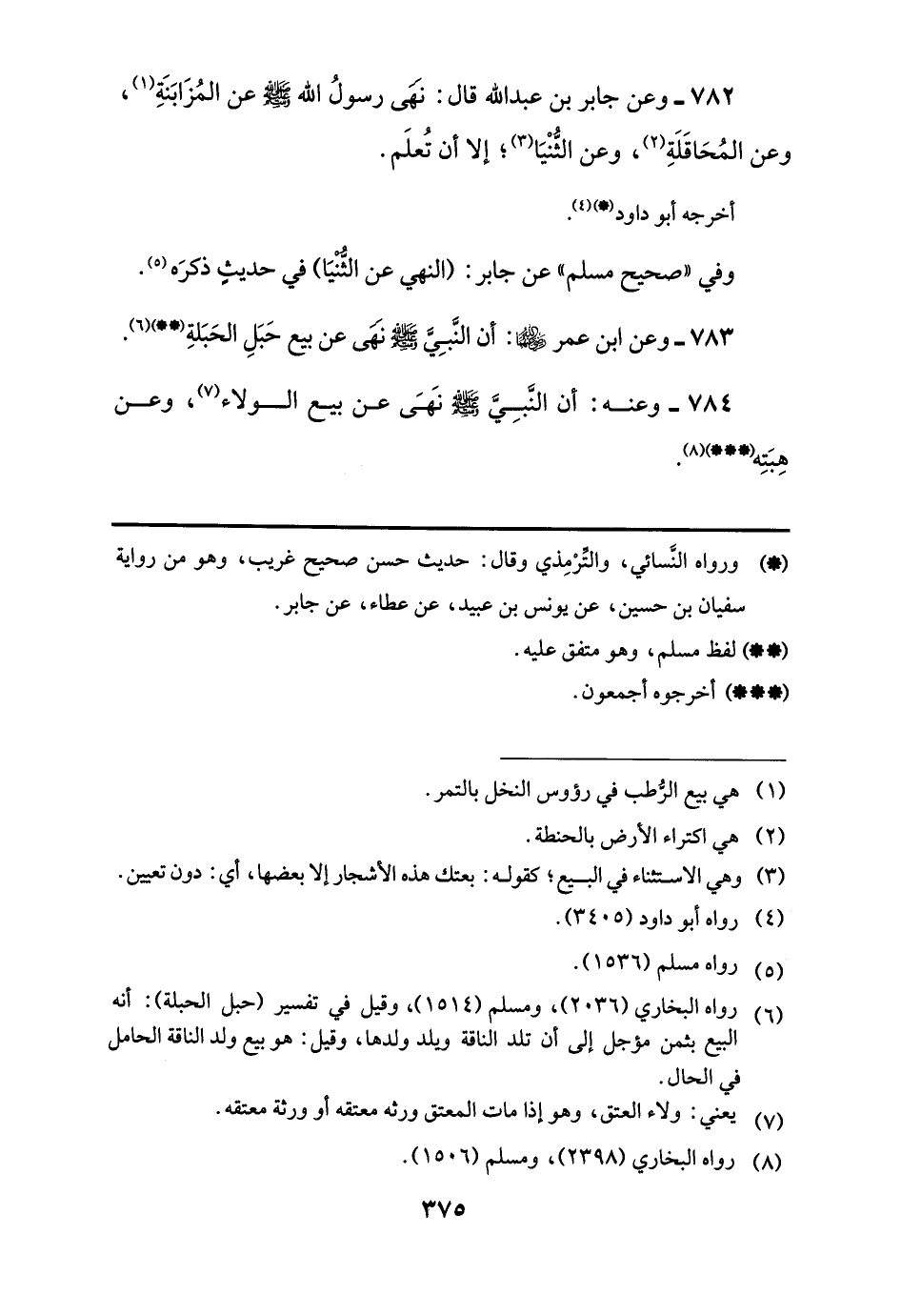 782 - وعن جابر بن عبد اللَّه قال: نهَى رسولُ اللَّه -صلى اللَّه عليه وسلم- عن المُزَابَنَةِ (¬1)، وعن المُحَاقَلَةِ (¬2)، وعن الثُّنْيَا (¬3)؛ إلا أن تُعلَم.