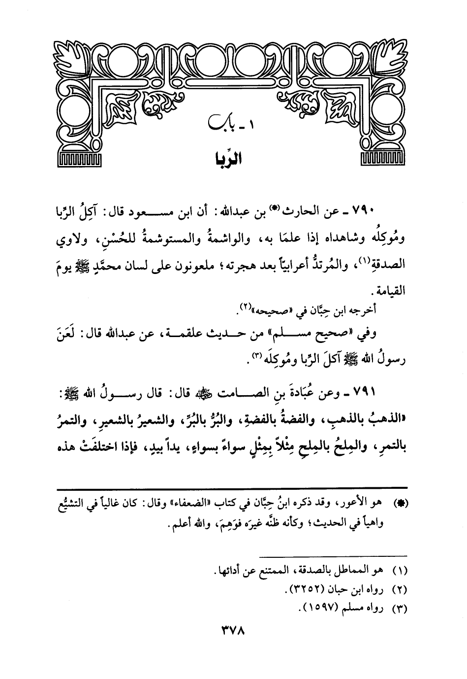 790 - عن الحارث (*) بن عبد اللَّه: أن ابن مسعود قال: آكِلُ الرِّبا ومُوكِلُه وشاهداه إذا علمَا به، والواشمةُ والمستوشمةُ للحُسْنِ، ولاوي الصدقةِ (¬1)، والمُرتدُّ أعرابيًّا بعد هجرته؛ ملعونون على لسان محمَّدٍ -صلى اللَّه عليه وسلم- يومَ القيامة.