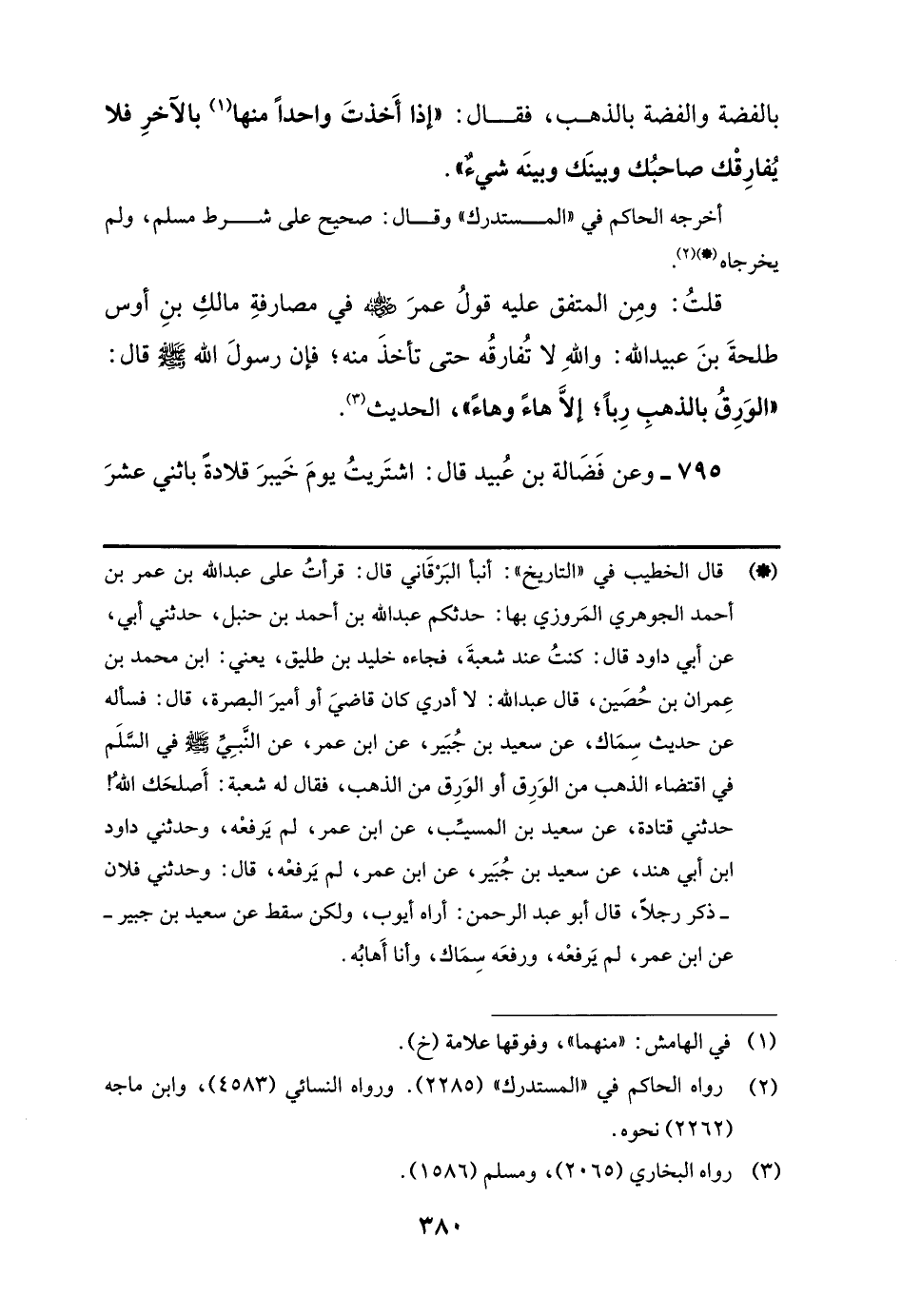 قلتُ: ومِن المتفق عليه قولُ عمرَ -رضي اللَّه عنه- في مصارفةِ مالكِ بنِ أوس طلحةَ بنَ عبيد اللَّه: واللَّهِ لا تُفارقُه حتى تأخذَ منه؛ فإن رسولَ اللَّه -صلى اللَّه عليه وسلم- قال: "الوَرِقُ بالذهبِ رِبًا؛ إلَّا هاءً وهاءً"، الحديث (¬3).
