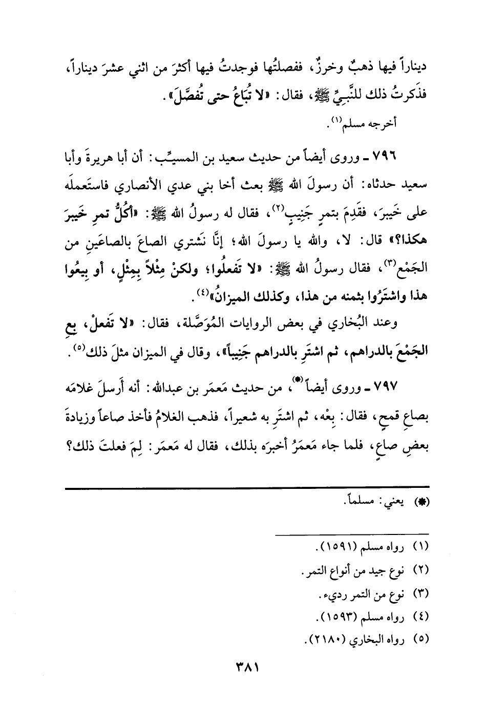 797 - وروى أيضًا (*)، من حديث مَعمَر بن عبد اللَّه: أنه أَرسلَ غلامَه بصاعِ قمحٍ، فقال: بِعْه، ثم اشتَرِ به شعيرًا، فذهب الغلامُ فأخذ صاعًا وزيادةَ بعضِ صاعٍ، فلما جاء مَعمَرُ أخبرَه بذلك، فقال له مَعمَر: لِمَ فعلتَ ذلك؟