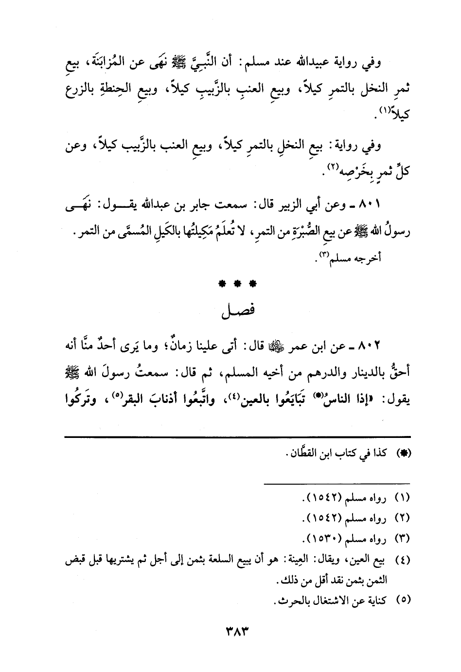 802 - عن ابن عمر -رضي اللَّه عنهما- قال: أتى علينا زمانٌ؛ وما يَرى أحدٌ منَّا أنه أحقُّ بالدينار والدرهم من أخيه المسلم، ثم قال: سمعتُ رسولَ اللَّه -صلى اللَّه عليه وسلم- يقول: "إذا الناسُ (*) تَبَايَعُوا بالعين (¬4)، واتَّبعُوا أذنابَ البقر (¬5)، وتَركُوا
