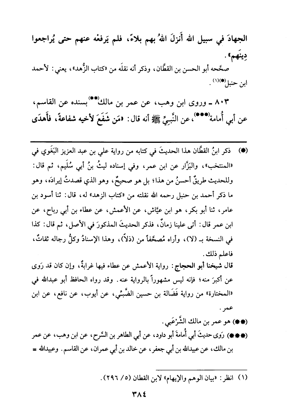 803 - وروى ابن وهب، عن عمر بن مالك (**) بسنده عن القاسم، عن أبي أُمامة (...)، عن النَّبِيِّ -صلى اللَّه عليه وسلم- أنه قال: "مَن شَفَعَ لأخيه شفاعةً، فأَهدَى