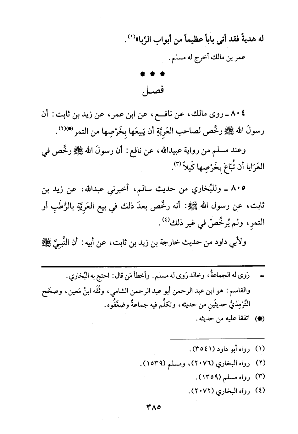804 - روى مالك، عن نافع، عن ابن عمر، عن زيد بن ثابت: أن رسولَ اللَّه -صلى اللَّه عليه وسلم- رخَّص لصاحب العَرِيَّةِ أن يَبيعَها بِخَرْصِها من التمر (*) (¬2).