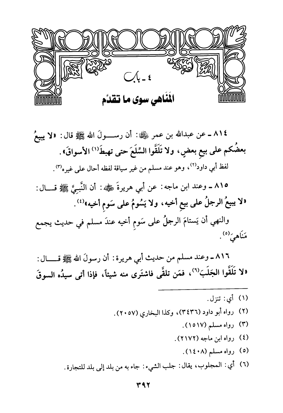 816 - وعند مسلم من حديث أبي هريرة: أن رسولَ اللَّه -صلى اللَّه عليه وسلم- قال: "لا تَلَقَّوا الجَلَبَ (¬6)، فمَن تلقَّى فاشتَرى منه شيئًا، فإذا أتى سيدُه السوقَ