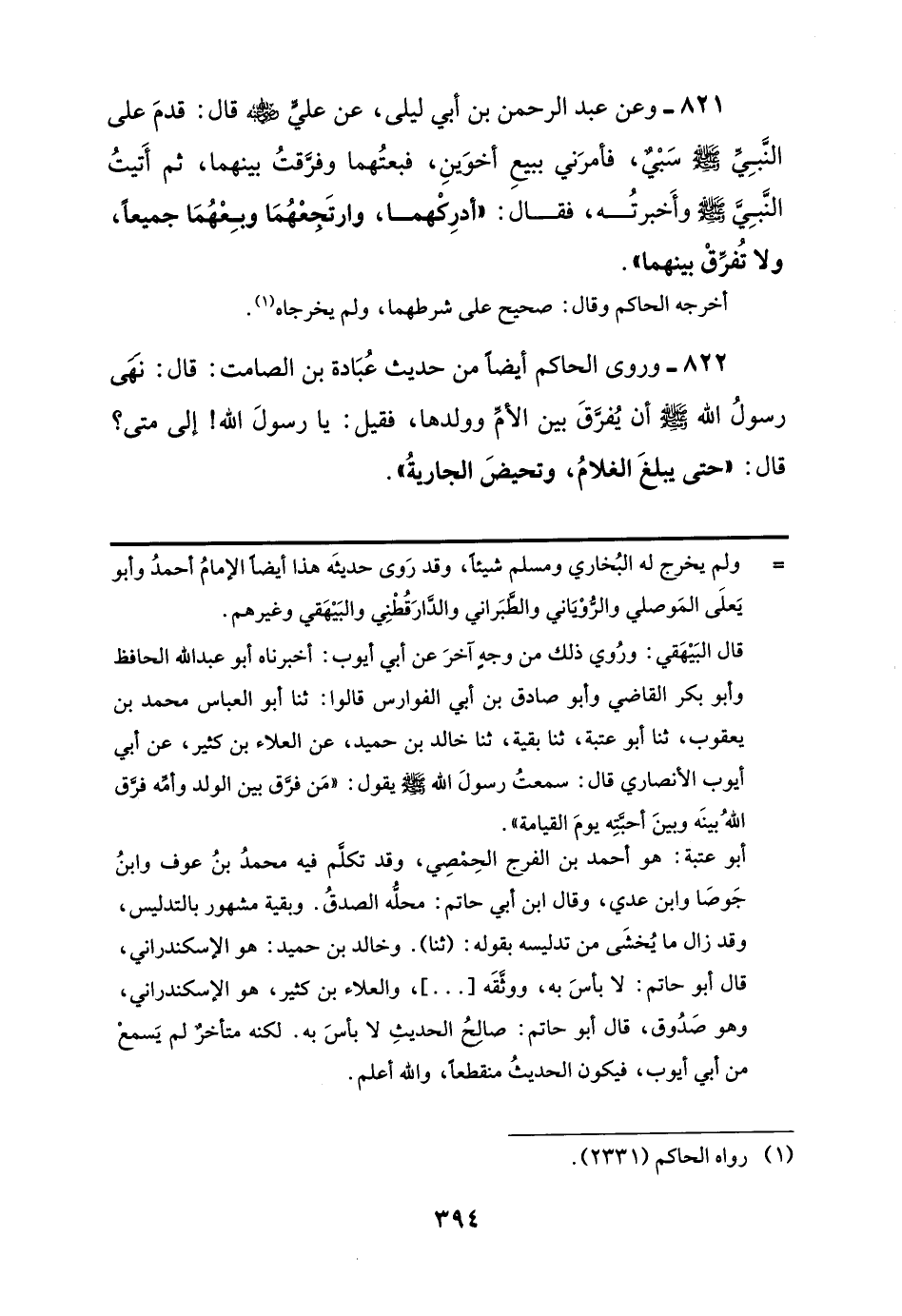 821 - وعن عبد الرحمن بن أبي ليلى، عن عليٍّ -رضي اللَّه عنه- قال: قدمَ على النَّبِيِّ -صلى اللَّه عليه وسلم- سَبْيٌ، فأمرَني ببيعِ أخوَينِ، فبعتُهما وفرَّقتُ بينهما، ثم أَتيتُ النَّبِيَّ -صلى اللَّه عليه وسلم- وأَخبرتُه، فقال: "أدرِكهما، وارتَجعْهُمَا وبِعْهُمَا جميعًا، ولا تُفرِّقْ بينهما".