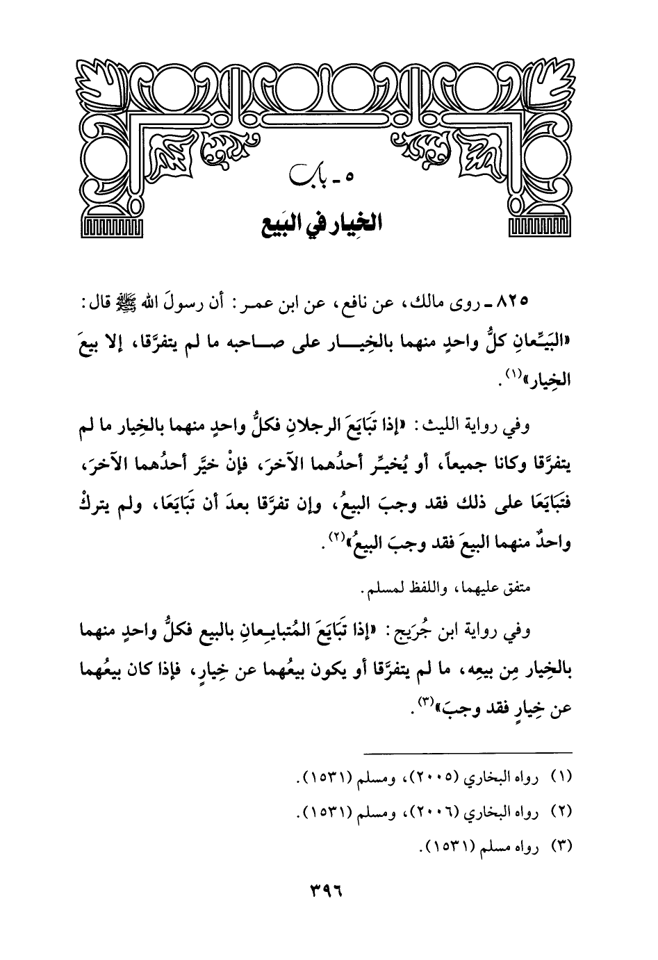 825 - روى مالك، عن نافع، عن ابن عمر: أن رسولَ اللَّه -صلى اللَّه عليه وسلم- قال: "البَيِّعانِ كلُّ واحدٍ منهما بالخِيار على صاحبه ما لم يتفرَّقا، إلا بيعَ الخِيار" (¬1).