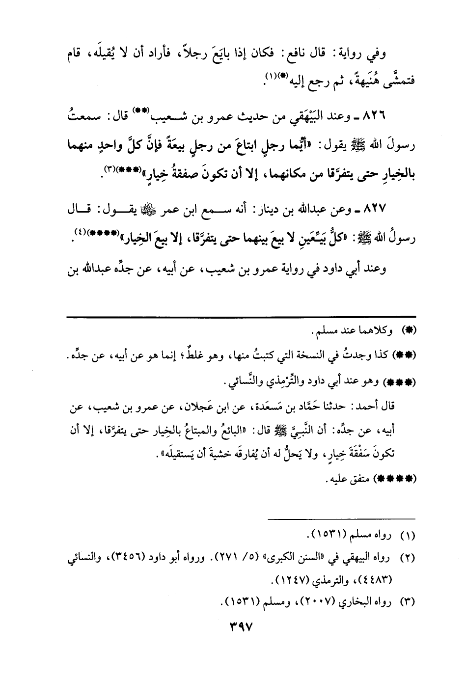 827 - وعن عبد اللَّه بن دينار: أنه سمع ابن عمر -رضي اللَّه عنهما- يقول: قال رسولُ اللَّه -صلى اللَّه عليه وسلم-: "كلُّ بَيِّعَينِ لا بيعَ بينهما حتى يتفرَّقا، إلا بيعَ الخِيار" (****) (¬3).