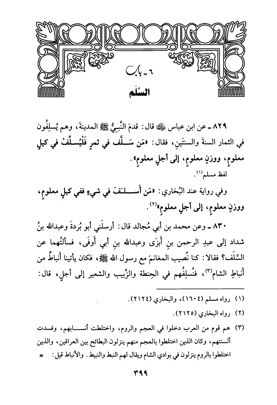 829 - عن ابن عباس -رضي اللَّه عنهما- قال: قدمَ النَّبِيُّ -صلى اللَّه عليه وسلم- المدينةَ، وهم يُسلِفُون في الثمار السنةَ والسنتَينِ، فقال: "مَن سَلَّف في ثمرٍ فَلْيُسلِّفْ في كيلٍ معلومٍ، ووزن معلومٍ، إلى أجلٍ معلومٍ".