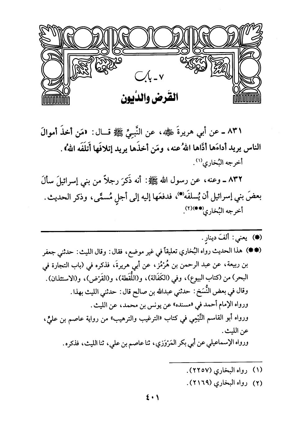 831 - عن أبي هريرةَ -رضي اللَّه عنه-، عن النَّبِيِّ -صلى اللَّه عليه وسلم- قال: "مَن أخذَ أموالَ الناس يريد أداءَها أدَّاها اللَّهُ عنه، ومَن أخذَها يريد إتلافَها أَتلَفَه اللَّه".