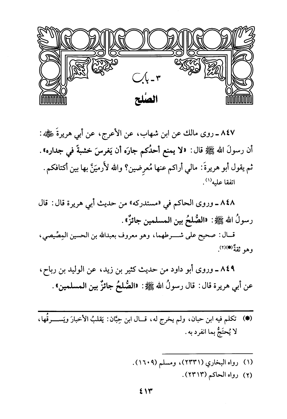 848 - وروى الحاكم في "مستدركه" من حديث أبي هريرة قال: قال رسولُ اللَّه -صلى اللَّه عليه وسلم-: "الصُّلحُ بين المسلمين جائزٌ".