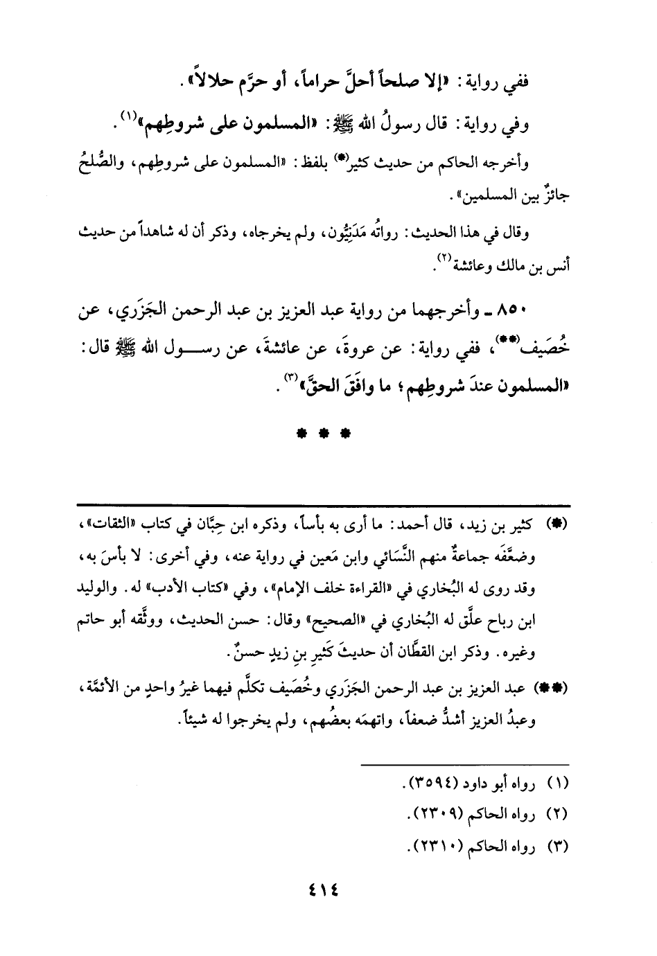 وأخرجه الحاكم من حديث كثير (*) بلفظ: "المسلمون على شروطِهم، والصُّلحُ جائزٌ بين المسلمين".