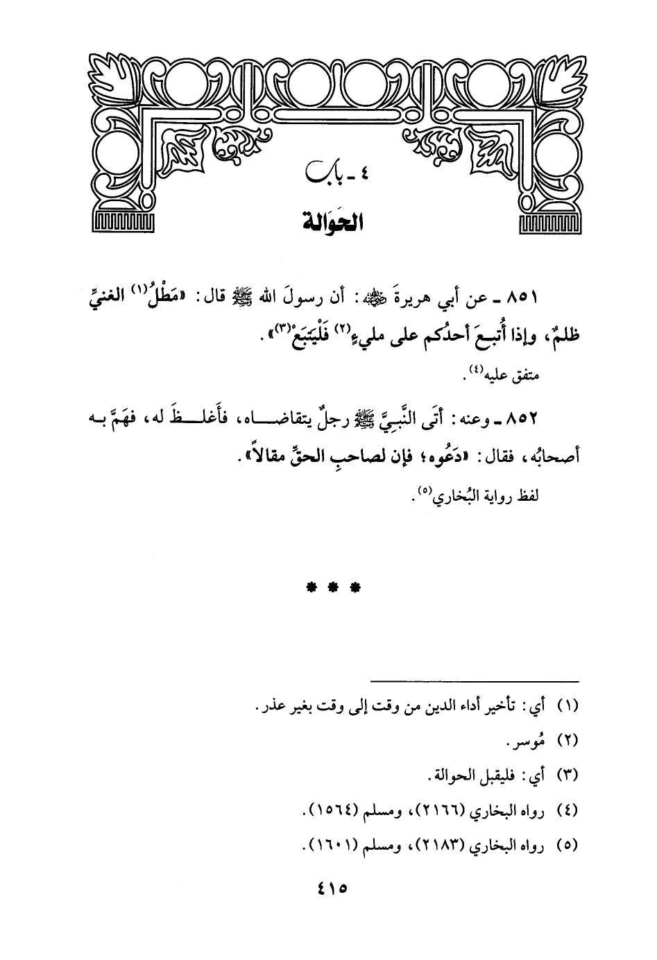 851 - عن أبي هريرةَ -رضي اللَّه عنه-: أن رسولَ اللَّه -صلى اللَّه عليه وسلم- قال: "مَطْلُ (¬1) الغنيِّ ظلمٌ، وإذا أُتبعَ أحدُكم على مليءٍ (¬2) فَلْيَتبَعْ (¬3) ".