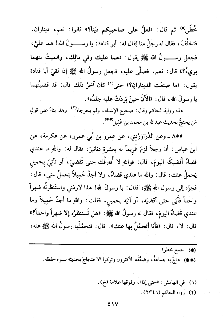 855 - وعن الدَّرَاوَرْدِي، عن عمرو بن أبي عمرو، عن عكرمة، عن ابن عباس: أن رجلًا لزمَ غَرِيمًا له بعشرةِ دنانيرَ، فقال له: واللَّهِ ما عندي قضاءٌ أَقضيكَه اليومَ، قال: فواللَّهِ لا أُفارقُك حتى تَقضيَ، أو تأتِيَ بِحميلٍ يَحملُ عنك، قال: واللَّه ما عندي قضاءٌ، ولا أجدُ حَمِيلًا يَحملُ عني، قال: فجرَّه إلى رسول اللَّه -صلى اللَّه عليه وسلم-، فقال: يا رسولَ اللَّه! هذا لازمَني واستَنظرتُه شهرًا واحدًا فأَبَى حتى أقضيَه، أو آتيَه بحميلٍ، فقلت: واللَّهِ ما أجدُ حَمِيلًا وما عندي قضاءٌ اليومَ، فقال له رسولُ اللَّه -صلى اللَّه عليه وسلم-: "هل تَستنظرُه إلا شهرًا واحدًا؟ " قال: لا، قال: "فأنا أتحمَّلُ بها عنك". قال: فتحمَّلَها رسولُ اللَّه -صلى اللَّه عليه وسلم- عنه،
