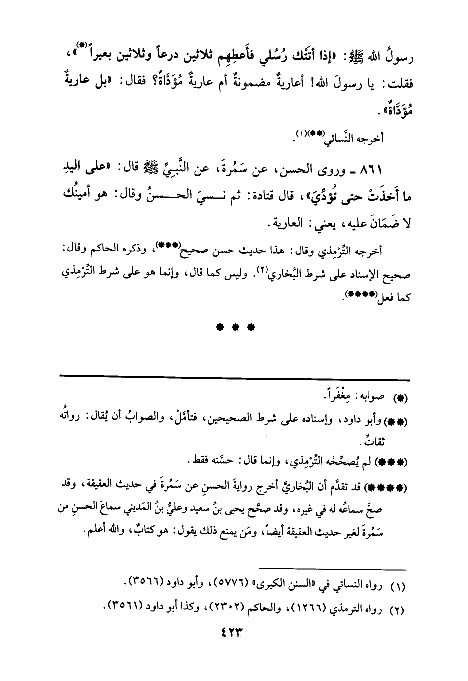 (****) قد تقدَّم أن البُخاريَّ أخرج روايةَ الحسنِ عن سَمُرةَ في حديث العقيقة، وقد صحَّ سماعُه له في غيره، وقد صحَّح يحيى بنُ سعيد وعليُّ بنُ المَديني سماعَ الحسنِ من سَمُرةَ لغير حديث العقيقة أيضًا، ومَن يمنع ذلك يقول: هو كتابٌ، واللَّه أعلم.
