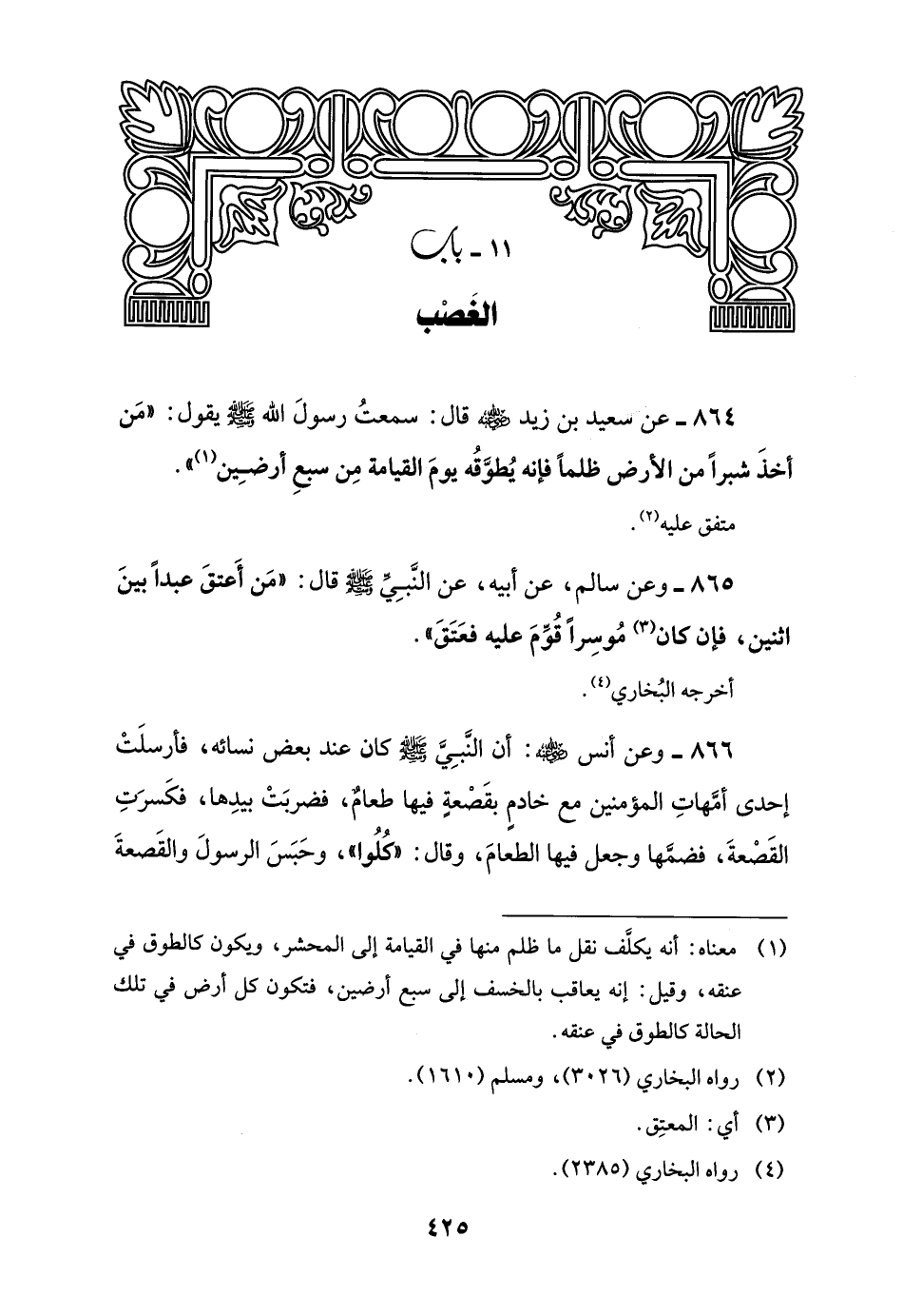 864 - عن سعيد بن زيد -رضي اللَّه عنه- قال: سمعتُ رسولَ اللَّه -صلى اللَّه عليه وسلم- يقول: "مَن أخذَ شبرًا من الأرض ظلمًا فإنه يُطوَّقُه يومَ القيامة مِن سبعِ أرضِين (¬1) ".