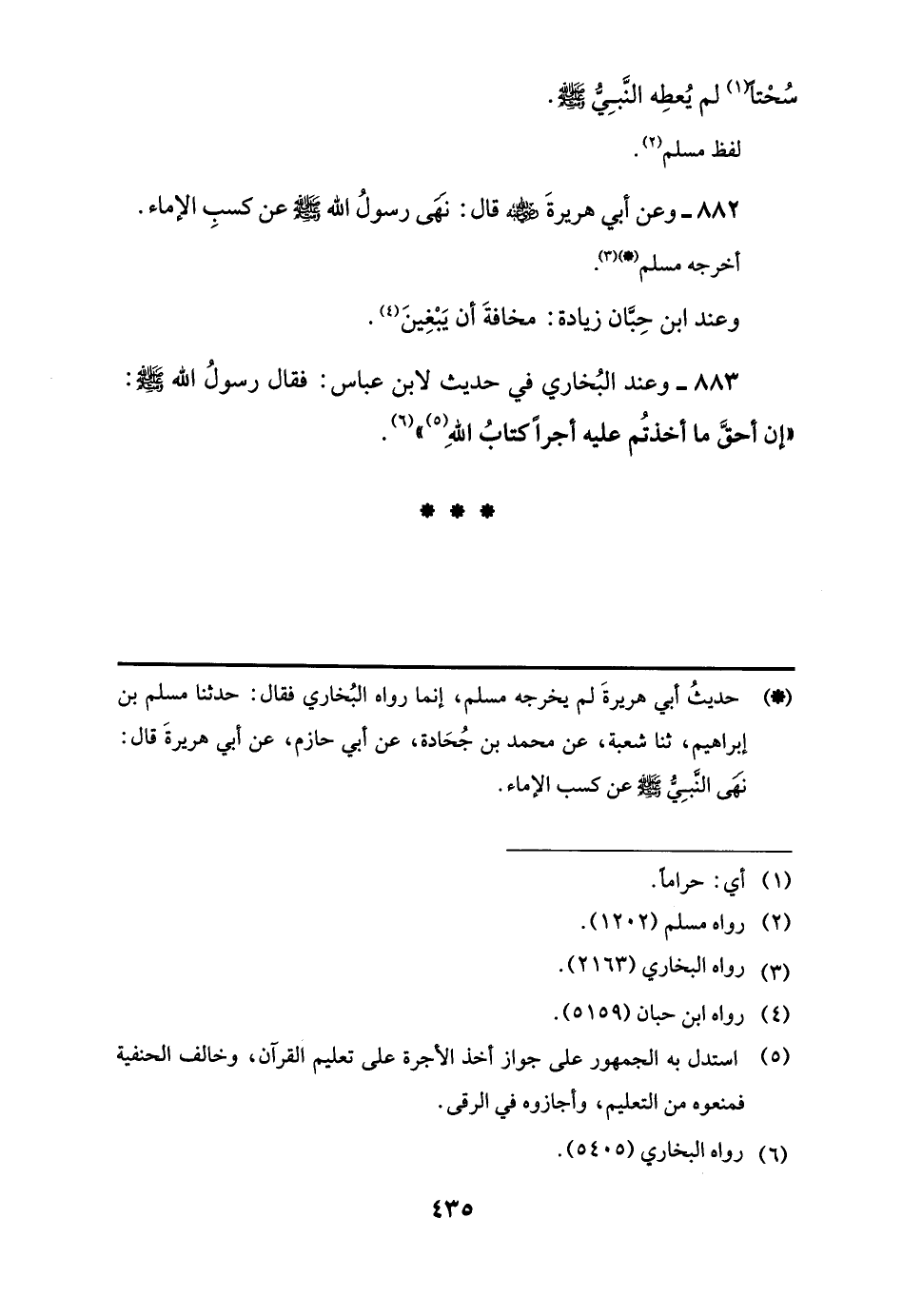 (*) حديثُ أبي هريرةَ لم يخرجه مسلم، إنما رواه البُخاري فقال: حدثنا مسلم بن إبراهيم، ثنا شعبة، عن محمد بن جُحَادة، عن أبي حازم، عن أبي هريرةَ قال: نَهَى النَّبِيُّ -صلى اللَّه عليه وسلم- عن كسب الإماء.