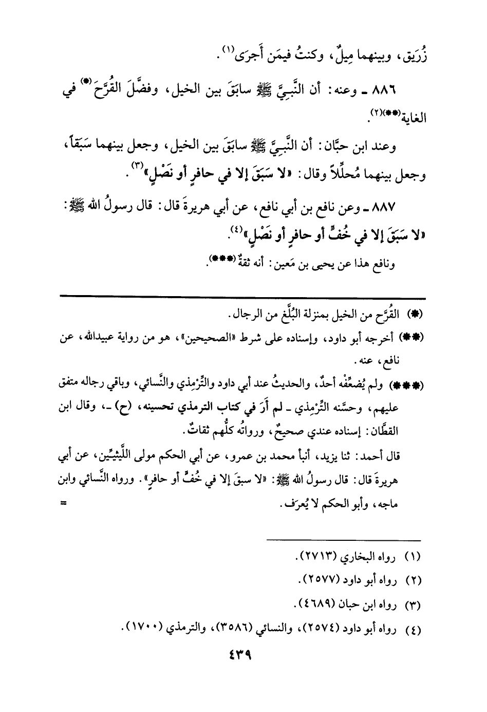 887 - وعن نافع بن أبي نافع، عن أبي هريرةَ قال: قال رسولُ اللَّه -صلى اللَّه عليه وسلم-: "لا سَبَقَ إلا في خُفٍّ أو حافرٍ أو نَصْلٍ" (¬4).