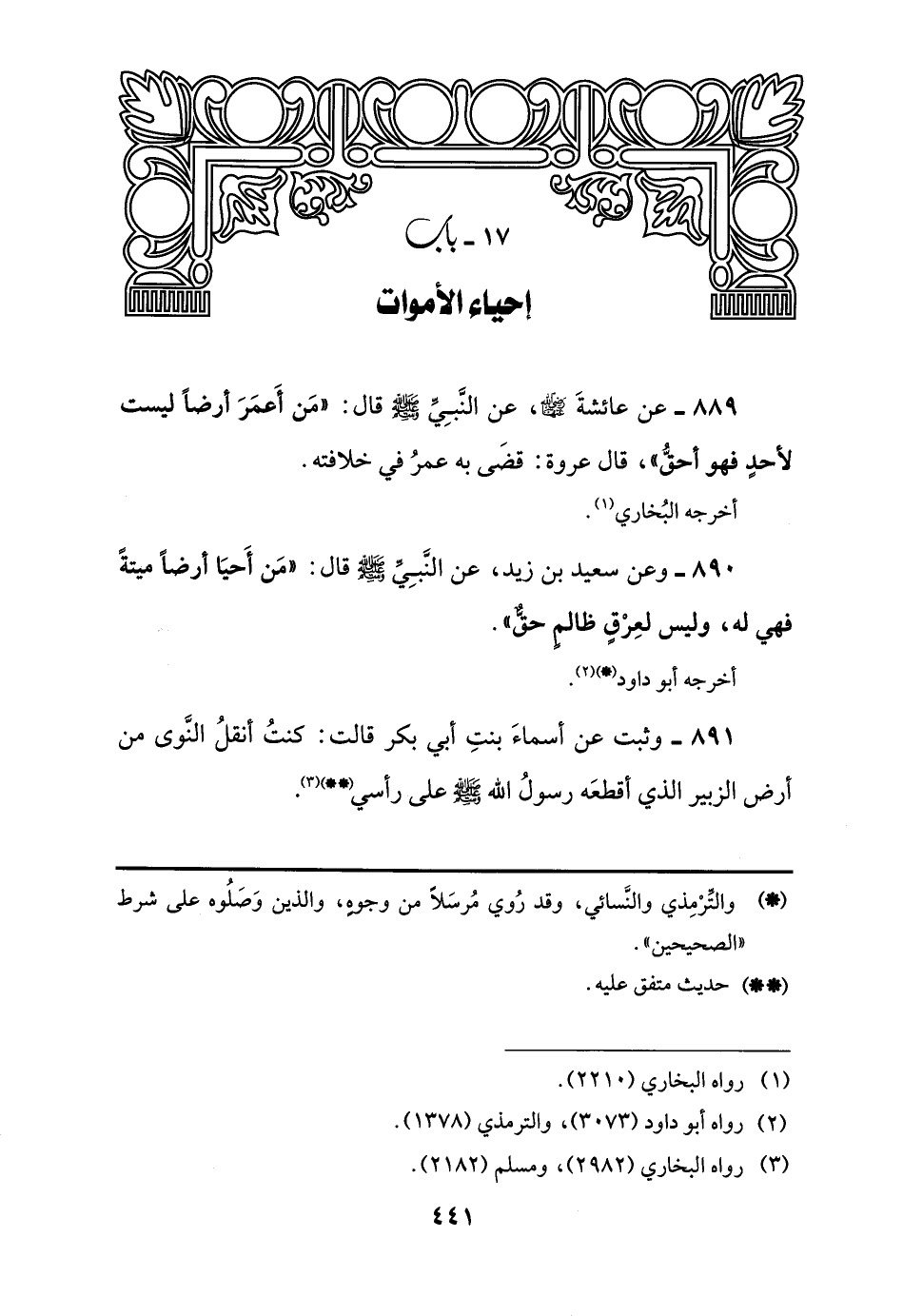 889 - عن عائشةَ -رضي اللَّه عنها-، عن النَّبِيِّ -صلى اللَّه عليه وسلم- قال: "مَن أَعمَرَ أرضًا ليست لأحدٍ فهو أحقُّ"، قال عروة: قضَى به عمرُ في خلافته.