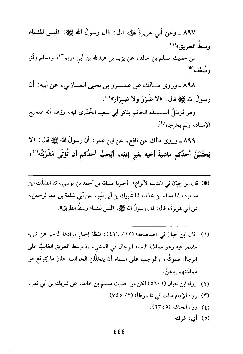 (*) قال ابن حِبَّان في "كتاب الأنواع": أخبرنا عبد اللَّه بن أحمد بن موسى، ثنا الصَّلْت ابن مسعود، ثنا مسلم بن خالد، ثنا شَرِيك بن أبي نَمِر، عن أبي سَلَمة بن عبد الرحمن، عن أبي هريرةَ، قال: قال رسولُ اللَّه -صلى اللَّه عليه وسلم-: "ليس للنساء وسطُ الطريق".