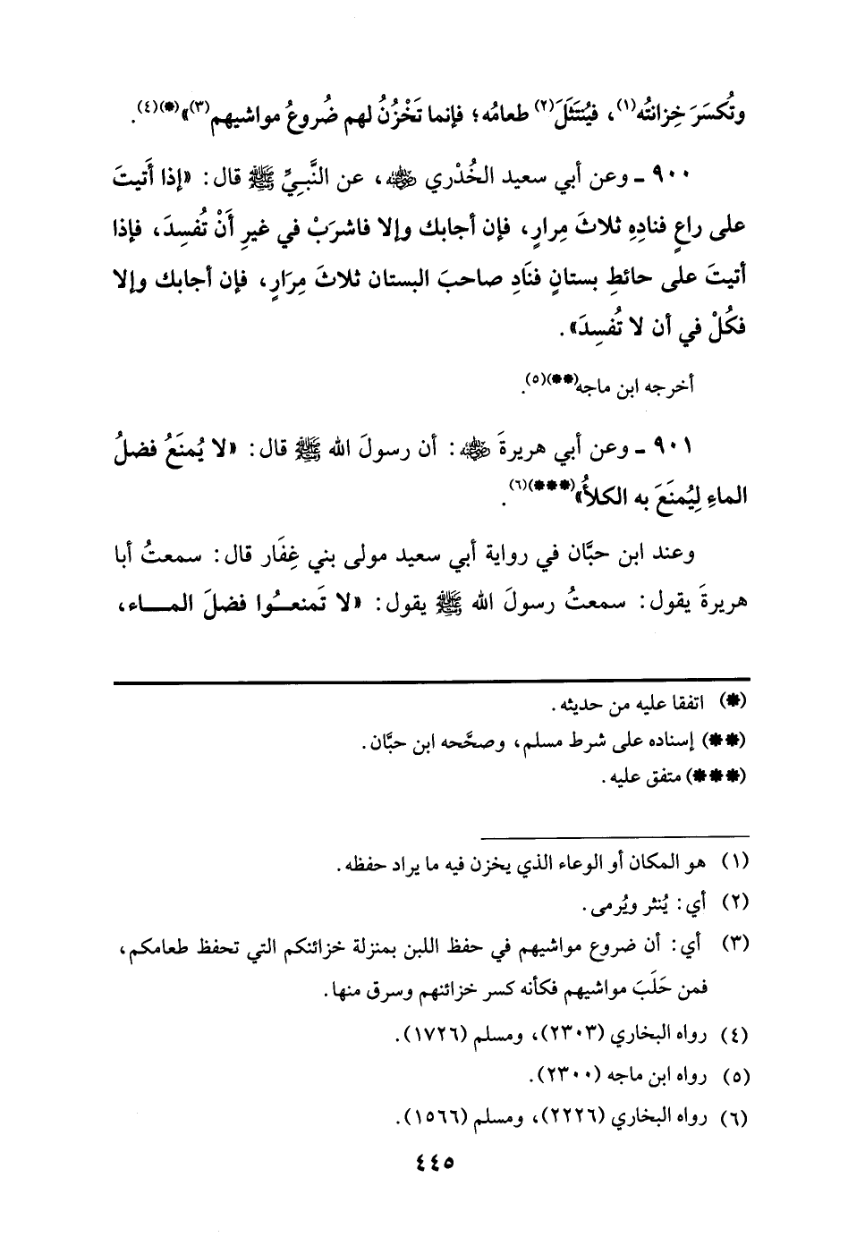 901 - وعن أبي هريرةَ -رضي اللَّه عنه-: أن رسولَ اللَّه -صلى اللَّه عليه وسلم- قال: "لا يُمنَعُ فضلُ الماءِ لِيُمنَعَ به الكلأُ" (...) (¬6).