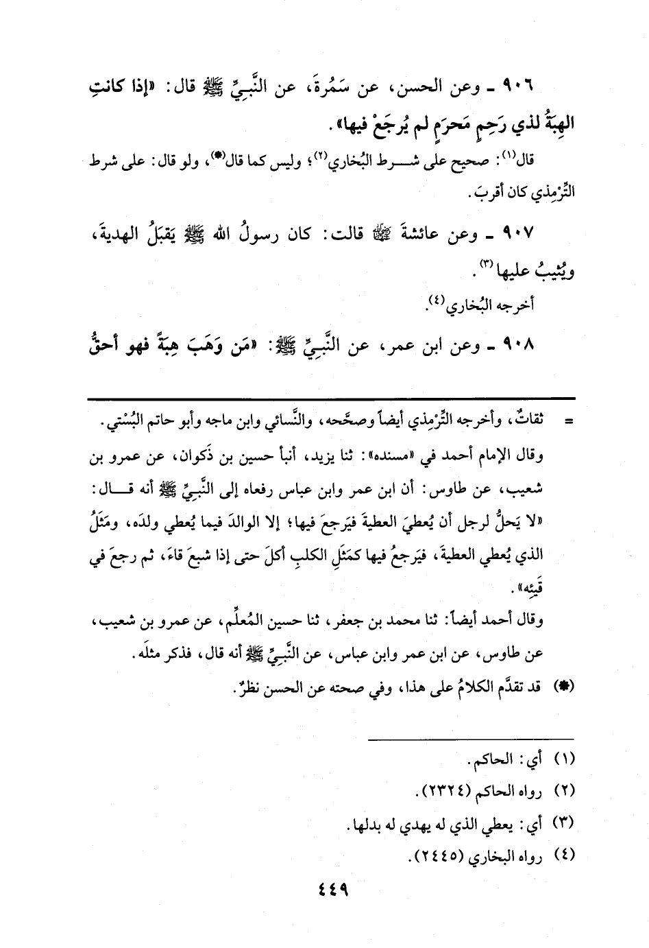 906 - وعن الحسن، عن سَمُرةَ، عن النَّبِيِّ -صلى اللَّه عليه وسلم- قال: "إذا كانتِ الهِبَةُ لذي رَحِمٍ مَحرَمٍ لم يُرجَعْ فيها".