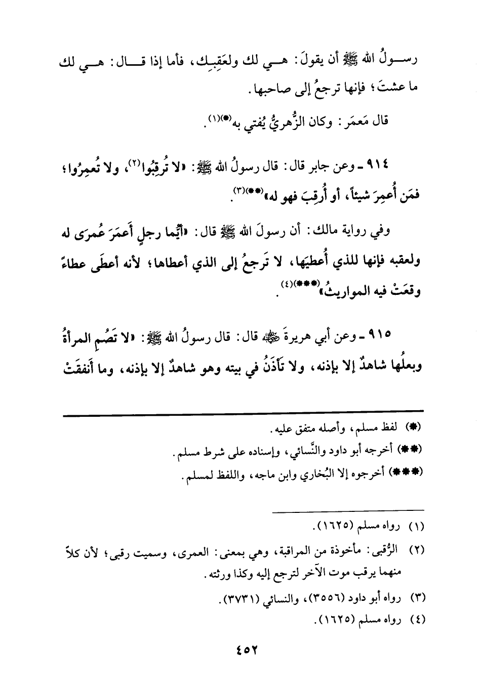 914 - وعن جابر قال: قال رسولُ اللَّه -صلى اللَّه عليه وسلم-: "لا تُرقِبُوا (¬2)، ولا تُعمِرُوا؛ فمَن أُعمِرَ شيئًا، أو أُرقبَ فهو له" (**) (¬3).