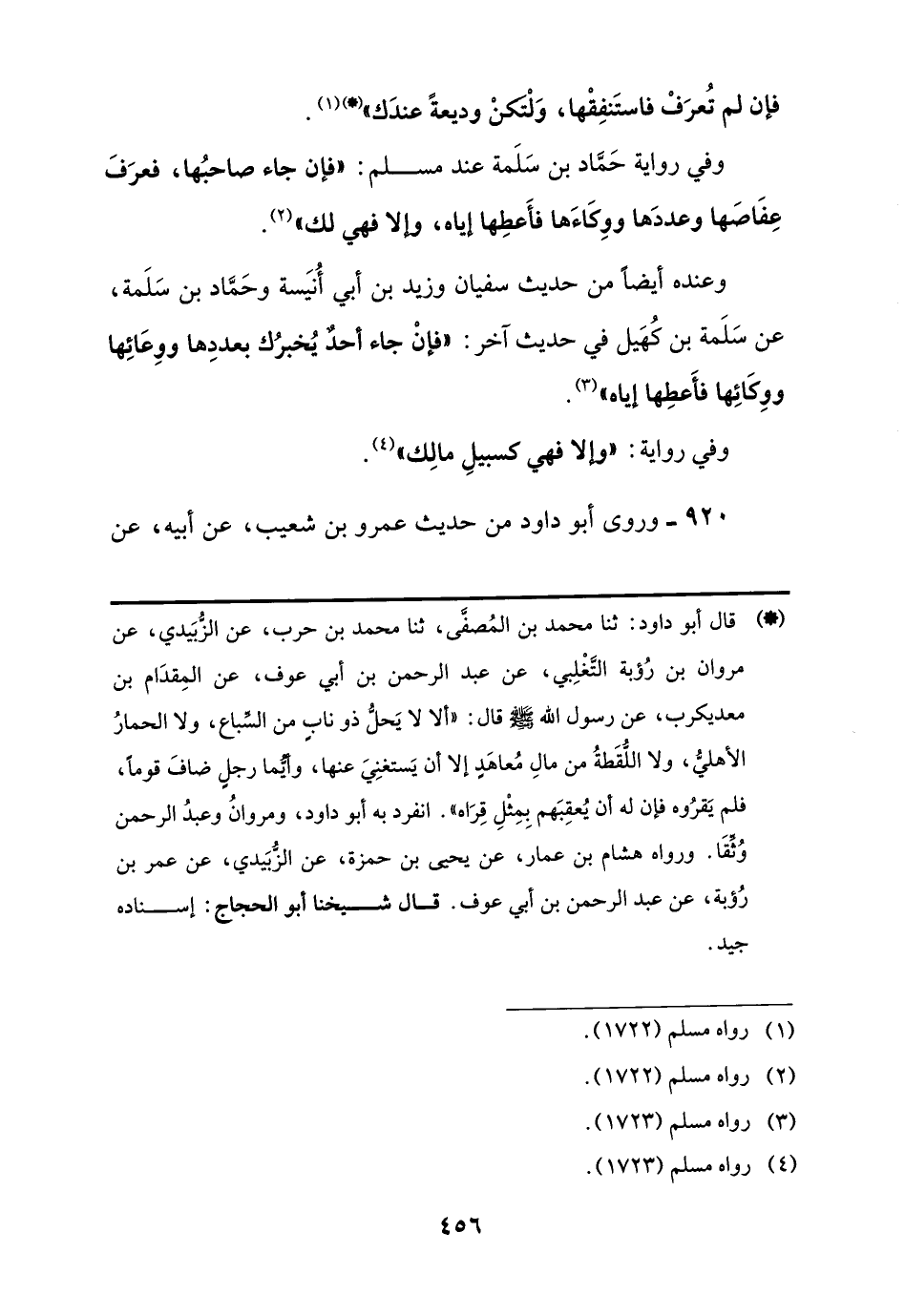 (*) قال أبو داود: ثنا محمد بن المُصفَّى، ثنا محمد بن حرب، عن الزُّبَيدي، عن مروان بن رُؤبة التَّغْلِبي، عن عبد الرحمن بن أبي عوف، عن المِقدَام بن معد يكرب، عن رسول اللَّه -صلى اللَّه عليه وسلم- قال: "ألا لا يَحلُّ ذو نابٍ من السِّباع، ولا الحمارُ الأهليُّ، ولا اللُّقَطةُ من مالِ مُعاهَدٍ إلا أن يَستغنِيَ عنها، وأَيُّما رجلٍ ضافَ قومًا، فلم يَقرُوه فإن له أنَّ يُعقِبَهم بِمِثْلِ قِرَاه". انفرد به أبو داود، ومروانُ وعبدُ الرحمن وُثِّقَا. ورواه هشام بن عمار، عن يحيى بن حمزة، عن الزُّبيدي، عن عمر بن رُؤبة، عن عبد الرحمن بن أبي عوف. قال شيخنا أبو الحجاج: إسناده جيد.