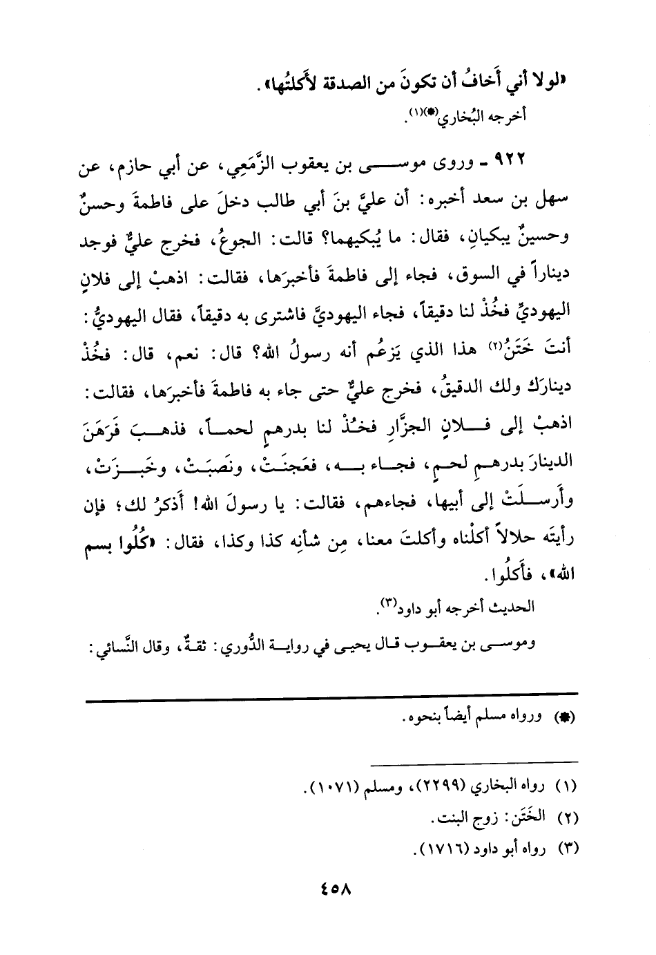 922 - وروى موسى بن يعقوب الزَّمَعِي، عن أبي حازم، عن سهل بن سعد أخبره: أن عليَّ بنَ أبي طالب دخلَ على فاطمةَ وحسنٌ وحسينٌ يبكيانِ، فقال: ما يُبكيهما؟ قالت: الجوعُ، فخرج عليٌّ فوجد دينارًا في السوق، فجاء إلى فاطمةَ فأخبرَها، فقالت: اذهبْ إلى فلانٍ اليهوديِّ فخُذْ لنا دقيقًا، فجاء اليهوديَّ فاشترى به دقيقًا، فقال اليهوديُّ: أنتَ خَتَنُ (¬2) هذا الَّذي يَزعُم أنَّه رسولُ اللَّه؟ قال: نعم، قال: فخُذْ دينارَك ولك الدقيقُ، فخرج عليٌّ حتى جاء به فاطمةَ فأخبرَها، فقالت: اذهبْ إلى فلانٍ الجزَّارِ فخُذْ لنا بدرهمٍ لحمًا، فذهبَ فَرَهَنَ الدينارَ بدرهمِ لحمٍ، فجاء به، فعَجنَتْ، ونَصبَتْ، وخَبزَتْ، وأَرسلَتْ إلى أبيها، فجاءهم، فقالت: يا رسولَ اللَّه! أَذكرُ لك؛ فإن رأيتَه حلالًا أكلْناه وأكلتَ معنا، مِن شأنِه كذا وكذا، فقال: "كُلُوا بسم اللَّه"، فأكلُوا.