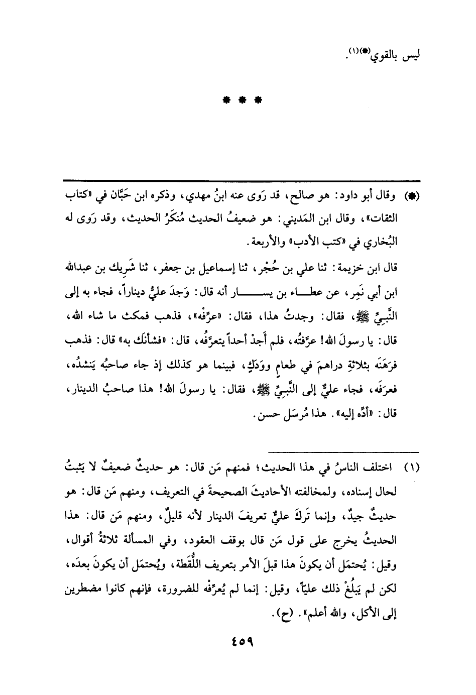 قال ابن خزيمة: ثنا علي بن حُجْر، ثنا إسماعيل بن جعفر، ثنا شَرِيك بن عبد اللَّه ابن أبي نَمِر، عن عطاء بن يسار أنَّه قال: وَجدَ عليُّ دينارًا، فجاء به إلى النَّبِيِّ -صلى اللَّه عليه وسلم-، فقال: وجدتُ هذا، فقال: "عرِّفْه"، فذهب فمكث ما شاء اللَّه، قال: يا رسولَ اللَّه! عرَّفتُه، فلم أَجدْ أحدًا يتعرَّفُه، قال: "فشأنَك به" قال: فذهب فرَهَنَه بثلاثةِ دراهمَ في طعامٍ ووَدَكٍ، فبينما هو كذلك إذ جاء صاحبُه يَنشدُه، فعرَفَه، فجاء عليٌّ إلى النَّبِيِّ -صلى اللَّه عليه وسلم-، فقال: يا رسولَ اللَّه! هذا صاحبُ الدينار، قال: "أدِّه إليه". هذا مُرسَل حسن.