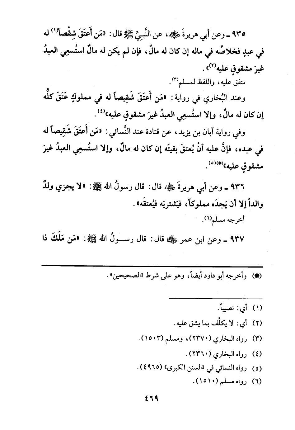 935 - وعن أبي هريرةَ -رضي اللَّه عنه-، عن النَّبِيِّ -صلى اللَّه عليه وسلم- قال: "مَن أَعتَقَ شِقْصًا (¬1) له في عبدٍ فخلاصُه في ماله إن كان له مالٌ، فإن لم يكن له مالٌ استُسعِي العبدُ غيرَ مشقوقٍ عليه (¬2) ".