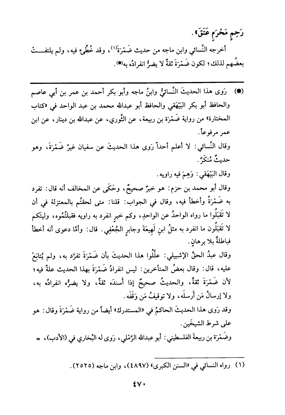 (*) رَوى هذا الحديثَ النَّسائيُّ وابنُ ماجة وأبو بكر أحمد بن عمر بن أبي عاصم والحافظ أبو بكر البَيْهَقي والحافظ أبو عبد اللَّه محمد بن عبد الواحد في "كتاب المختارة" من رواية ضَمْرَة بن ربيعة، عن الثَّوري، عن عبد اللَّه بن دينار، عن ابن عمر مرفوعًا.