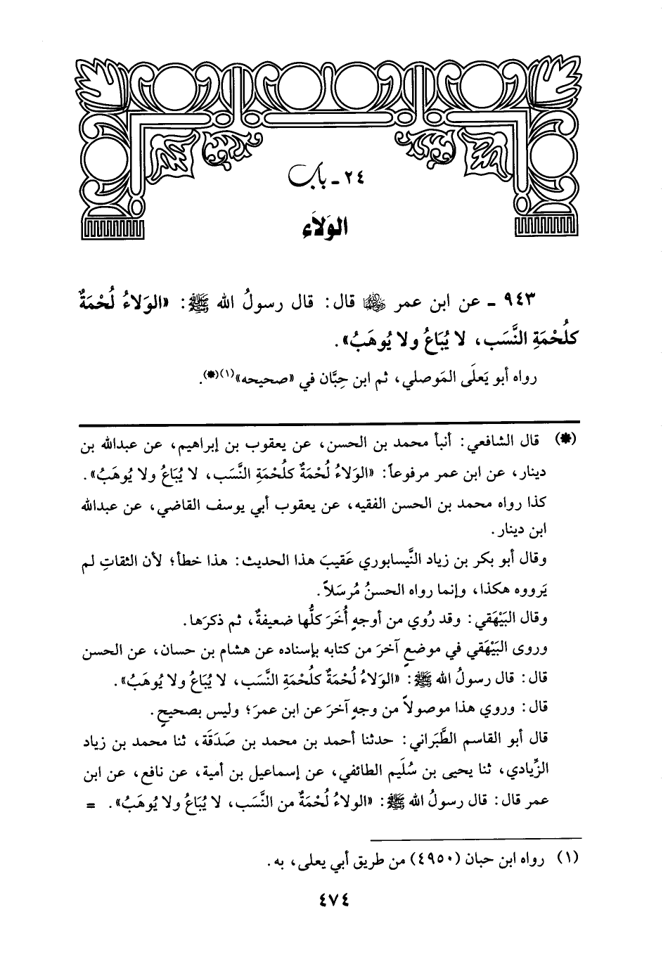 943 - عن ابن عمر -رضي اللَّه عنهما- قال: قال رسولُ اللَّه -صلى اللَّه عليه وسلم-: "الوَلاءُ لُحْمَةٌ كلُحْمَةِ النَّسَب، لا يُبَاعُ ولا يُوهَبُ".