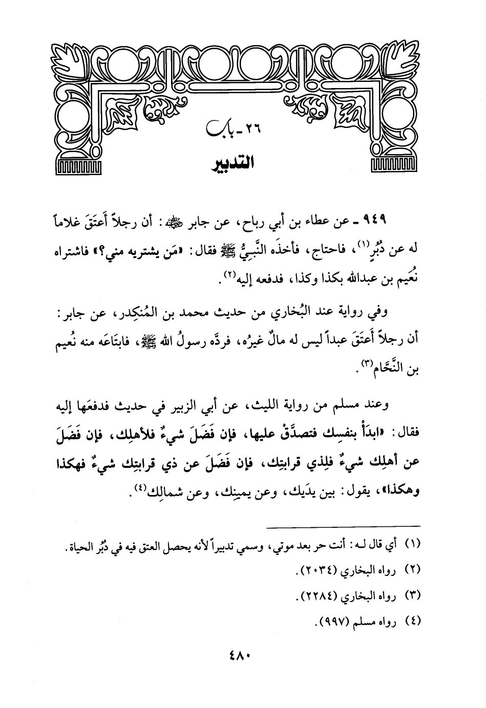 949 - عن عطاء بن أبي رباح، عن جابر -رضي اللَّه عنه-: أنَّ رجلًا أَعتَقَ غلامًا له عن دُبُرٍ (¬1)، فاحتاج، فأخذَه النَّبِيُّ -صلى اللَّه عليه وسلم- فقال: "مَن يشتريه مني؟ " فاشتراه نعيم بن عبد اللَّه بكذا وكذا، فدفعه إليه (¬2).