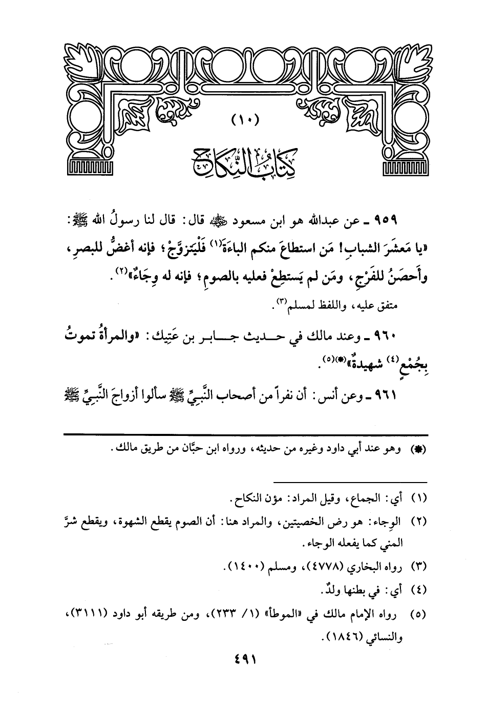 959 - عن عبد اللَّه هو ابن مسعود -رضي اللَّه عنه- قال: قال لنا رسولُ اللَّه -صلى اللَّه عليه وسلم-: "يا مَعشَرَ الشبابِ! مَن استطاعَ منكم الباءَةَ (¬1) فَلْيَتَزوَّجْ؛ فإنه أغضُّ للبصرِ، وأَحصَنُ للفَرْجِ، ومَن لم يَستطِعْ فعليه بالصومِ؛ فإنه له وِجَاءٌ" (¬2).