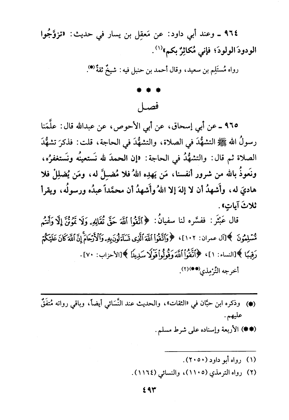 965 - عن أبي إسحاق، عن أبي الأحوص، عن عبد اللَّه قال: علَّمَنا رسولُ اللَّه -صلى اللَّه عليه وسلم- التشهُّدَ في الصلاة، والتشهُّدَ في الحاجة، قلت: فذكرَ تشهُّدَ الصلاة ثم قال: والتشهُّدُ في الحاجة: "إن الحمدَ للَّه نَستعينُه ونَستغفرُه، ونَعوذُ باللَّه من شرور أنفسنا، مَن يَهدِه اللَّهُ فلا مُضِلَّ له، ومَن يُضلِلْ فلا هاديَ له، وأَشهدُ أنَّ لا إلهَ إلا اللَّهُ وأَشهدُ أنَّ محمَّدًا عبدُه ورسولُه، ويقرأ ثلاثَ آياتٍ".
