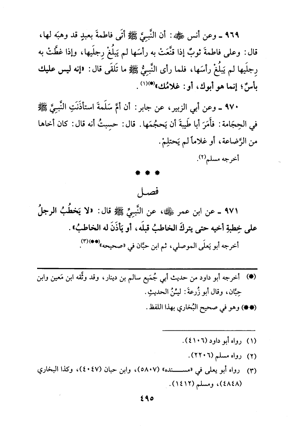 971 - عن ابن عمر -رضي اللَّه عنهما-، عن النَّبِيِّ -صلى اللَّه عليه وسلم- قال: "لا يَخطُبُ الرجلُ على خِطبةِ أخيه حتى يتركَ الخاطبُ قبلَه، أو يَأذَنَ له الخاطبُ".