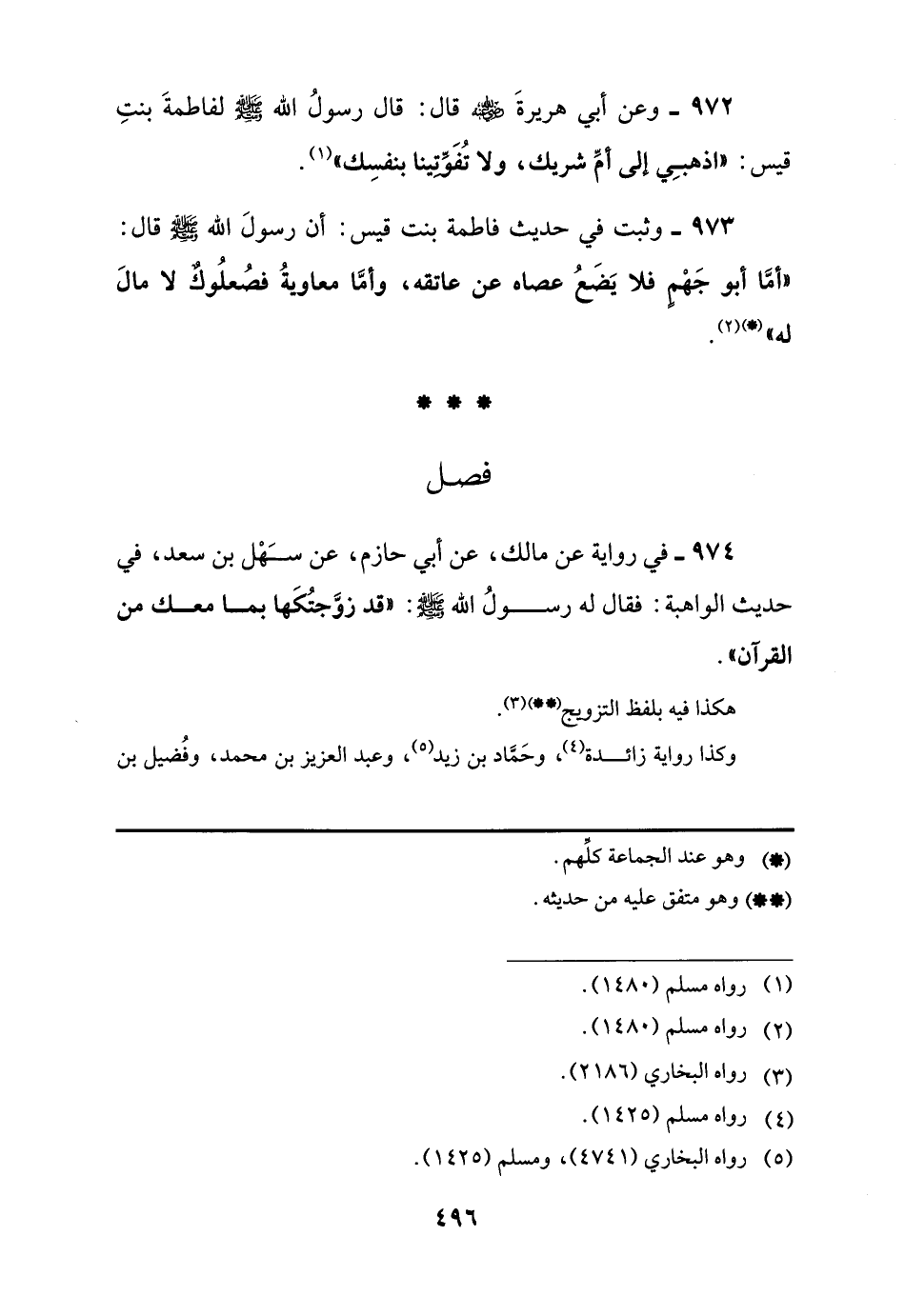 973 - وثبت في حديث فاطمة بنت قيس: أنَّ رسولَ اللَّه -صلى اللَّه عليه وسلم-: "أمَّا أبو جَهْمٍ فلا يَضَعُ عصاه عن عاتقه، وأمَّا معاويةُ فصُعلُوكٌ لا مالَ له" (*) (¬2).