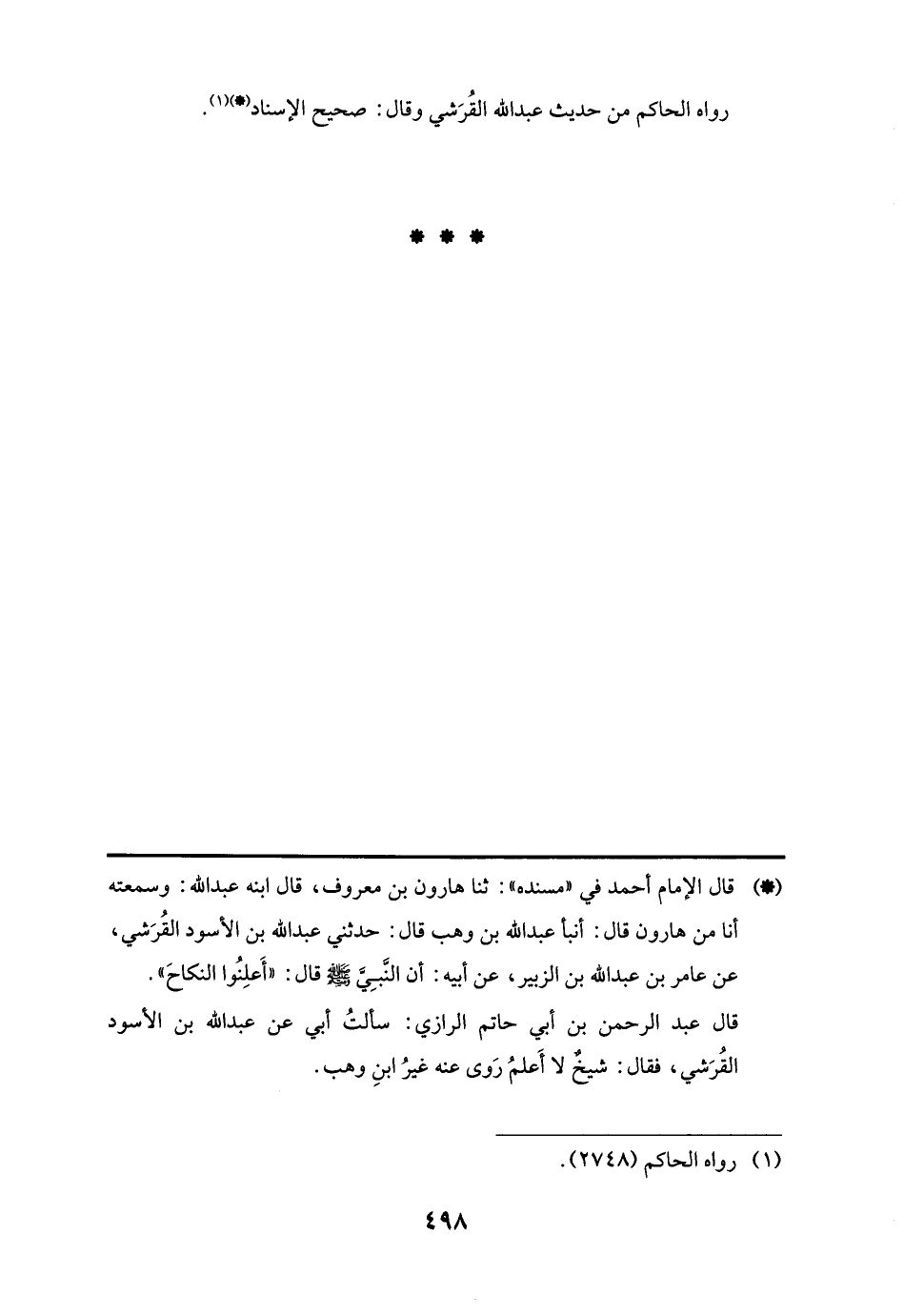 (*) قال الإمام أحمد في "مسنده": ثنا هارون بن معروف، قال ابنه عبد اللَّه: وسمعته أنا من هارون قال: أنبأ عبد اللَّه بن وهب قال: حدثني عبد اللَّه بن الأسود القُرَشي، عن عامر بن عبد اللَّه بن الزبير، عن أبيه: أنَّ النَّبِيَّ -صلى اللَّه عليه وسلم- قال: "أَعلِنُوا النكاحَ".