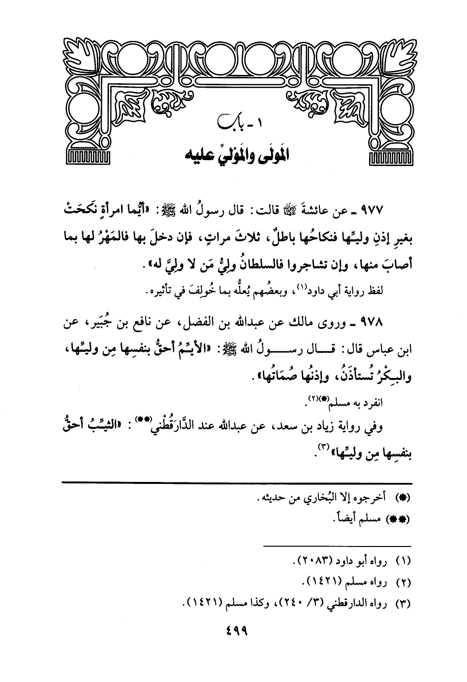 977 - عن عائشةَ -رضي اللَّه عنها- قالت: قال رسولُ اللَّه -صلى اللَّه عليه وسلم-: "أَيُّما امرأةٍ نَكَحَتْ بغيرِ إذنِ وليِّها فنكاحُها باطلٌ، ثلاثَ مراتٍ، فإن دخلَ بها فالمَهْرُ لها بما أصابَ منها، وإن تشاجروا فالسلطانُ ولِيُّ مَن لا ولِيَّ له".
