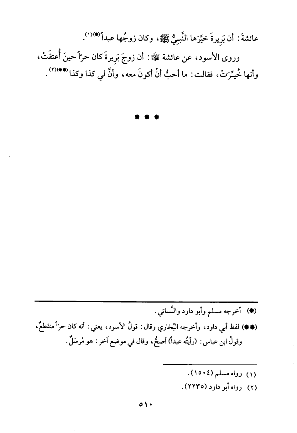 (**) لفظ أبي داود، وأخرجه البُخاري وقال: قولُ الأسود، يعني: أنه كان حرًا منقطعٌ، وقولُ ابن عباس: (رأيتُه عبدًا) أصحُّ، وقال في موضع آخر: هو مُرسَلٌ.