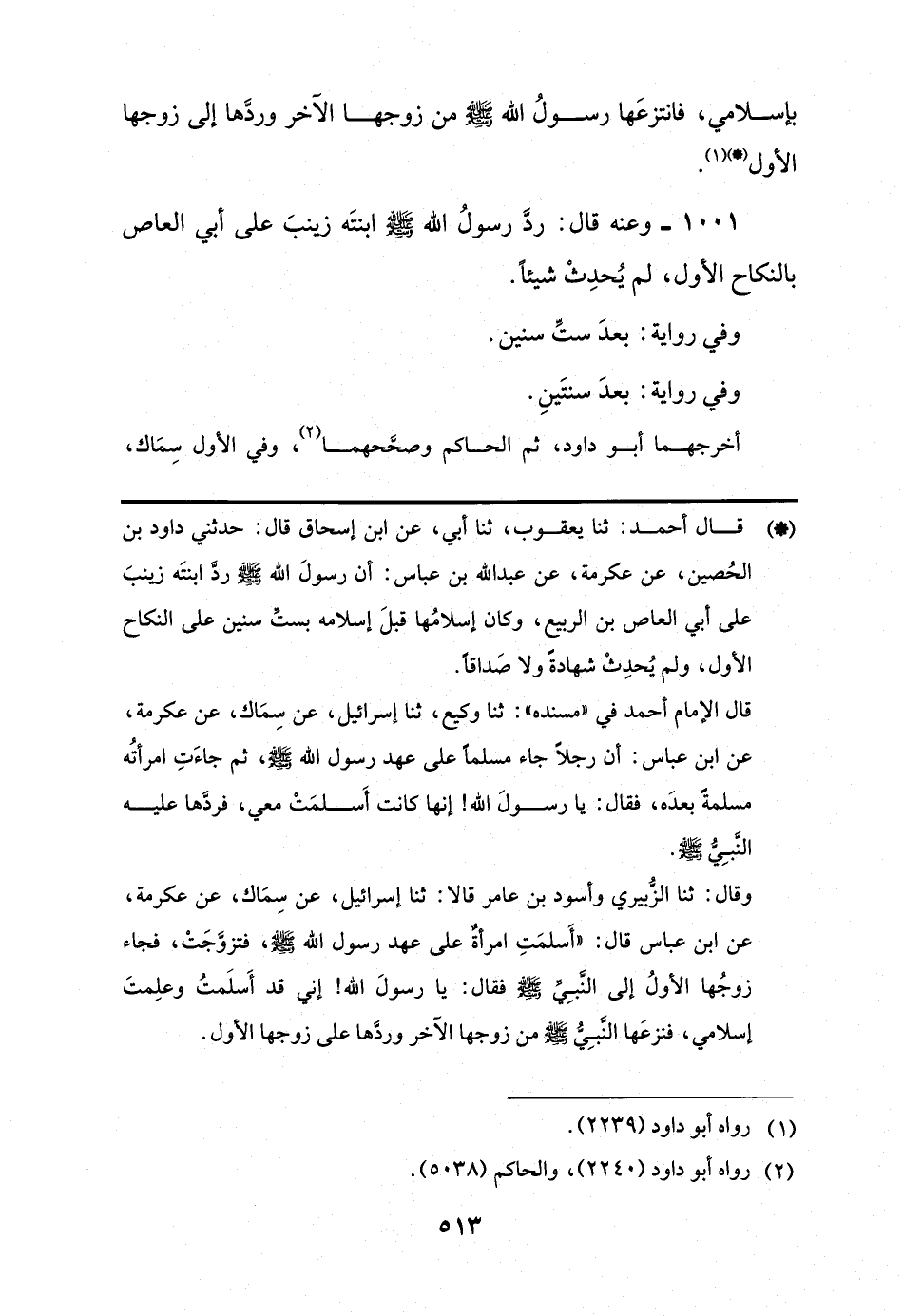 (*) قال أحمد: ثنا يعقوب، ثنا أبي، عن ابن إسحاق قال: حدثني داود بن الحُصين، عن عكرمة، عن عبد اللَّه بن عباس: أن رسولَ اللَّه -صلى اللَّه عليه وسلم- ردَّ ابنتَه زينبَ على أبي العاص بن الربيع، وكان إسلامُها قبلَ إسلامه بستِّ سنين على النكاح الأول، ولم يُحدِثْ شهادةً ولا صَداقًا.