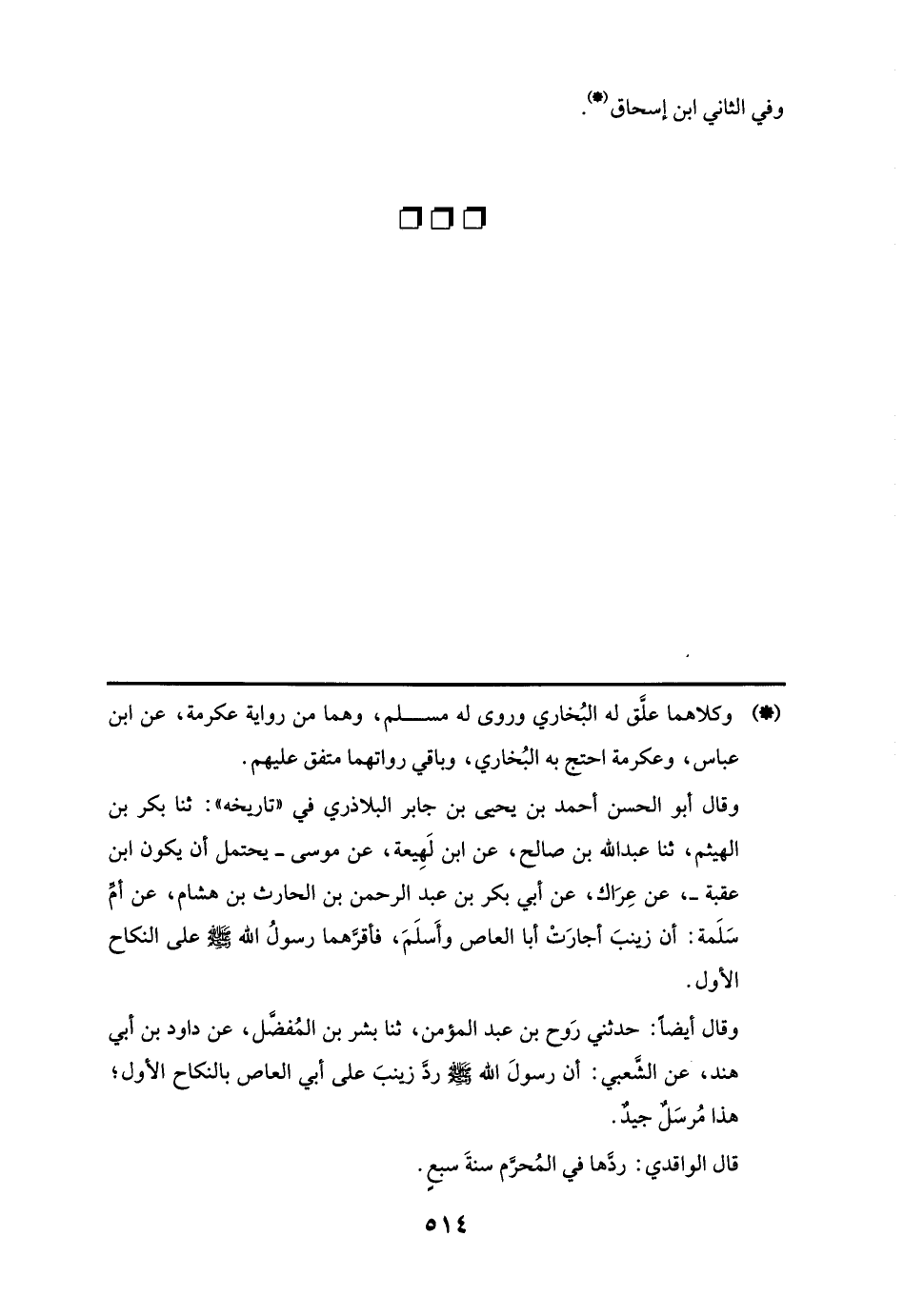 وقال أبو الحسن أحمد بن يحيى بن جابر البلاذري في "تاريخه": ثنا بكر بن الهيثم، ثنا عبد اللَّه بن صالح، عن ابن لَهِيعة، عن موسى -يحتمل أن يكون ابن عقبة-، عن عِرَاك، عن أبي بكر بن عبد الرحمن بن الحارث بن هشام، عن أمِّ سَلَمة: أن زينبَ أجارَتْ أبا العاص وأَسلَمَ، فأقرَّهما رسولُ اللَّه -صلى اللَّه عليه وسلم- على النكاح الأول.