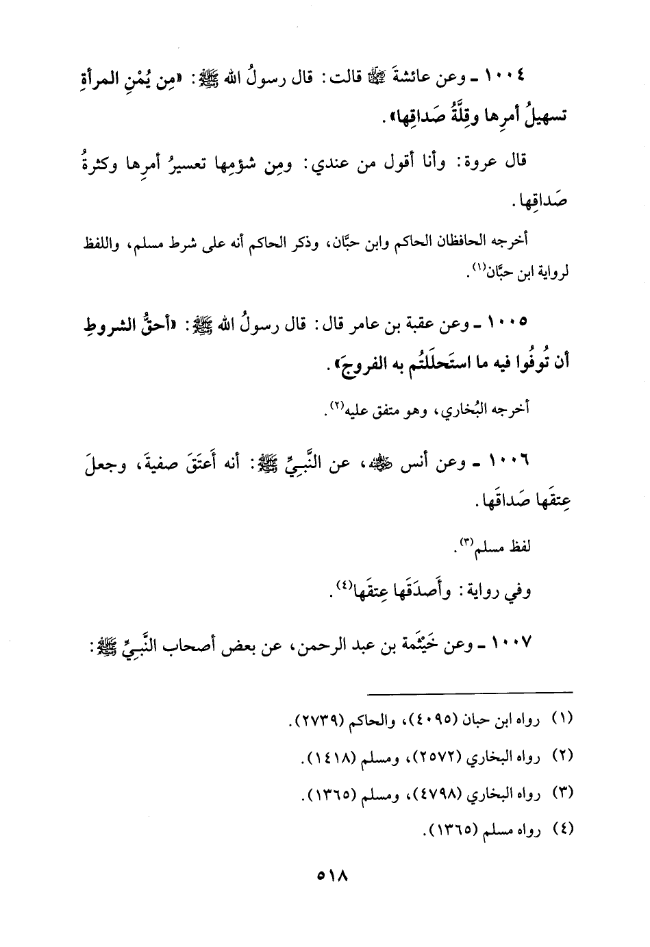 1004 - وعن عائشةَ -رضي اللَّه عنها- قالت: قال رسولُ اللَّه -صلى اللَّه عليه وسلم-: "مِن يُمْنِ المرأةِ تسهيلُ أمرِها وقِلَّةُ صَداقِها".