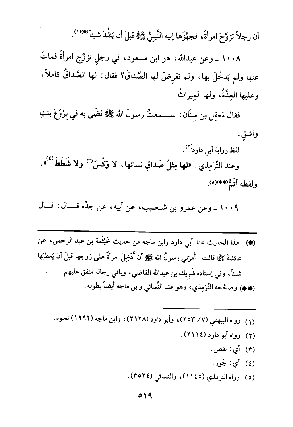 (*) هذا الحديث عند أبي داود وابن ماجه من حديث خَيْثَمة بن عبد الرحمن، عن عائشةَ -رضي اللَّه عنها- قالت: أَمرَني رسولُ اللَّه -صلى اللَّه عليه وسلم- أن أُدْخِلَ امرأةً على زوجها قبلَ أن يُعطيَها شيئًا، وفي إسناده شَرِيك بن عبد اللَّه القاضي، وباقي رجاله متفق عليهم.