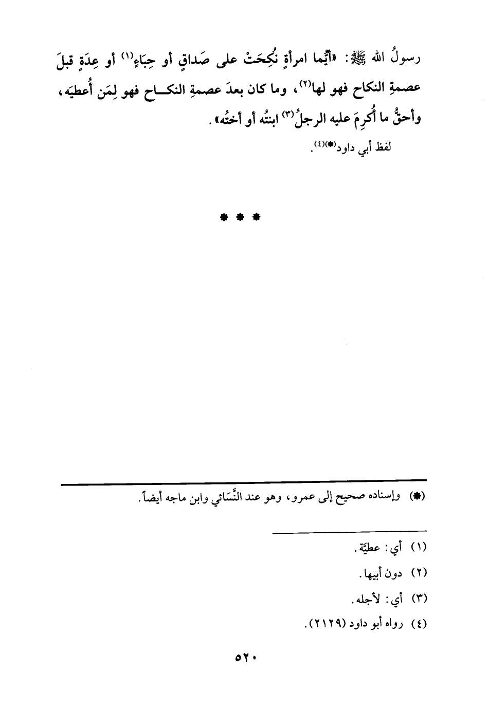 رسولُ اللَّه -صلى اللَّه عليه وسلم-: "أيُّما امرأةٍ نُكِحَتْ على صَداقٍ أو حِبَاءٍ (¬1) أو عِدَةٍ قبلَ عصمةِ النكاح فهو لها (¬2)، وما كان بعدَ عصمةِ النكاح فهو لِمَن أُعطيَه، وأحقُّ ما أكُرِمَ عليه الرجلُ (¬3) ابنتُه أو أختُه".